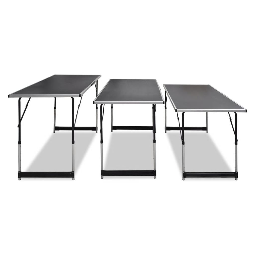 Dieses Set umfasst 3 höhenverstellbare Tapeziertische. Es eignet sich hervorragend für eine Vielzahl von Anwendungen, wie z.B. Tapezieren, Heimdekorationen, Bastelprojekte, Materialmessungen und vieles mehr! Die schwarze Tischplatte aus MDF lässt sich einfach reinigen und wird von einem Gestell aus Eisen und robustem, leichtem Aluminium getragen, was die Tische sehr robust und stabil macht. Die 3 Tapeziertische bieten eine maximale Belastbarkeit von je 30 kg und lassen sich auf eine Höhe von 73 / 80 / 87 / 94 cm bringen. Diese 3 Tische können durch die angebrachten Haken aneinander befestigt werden. Alle 3 Tische lassen sich zusammenklappen und daher bei Nichtgebrauch einfach verstauen.