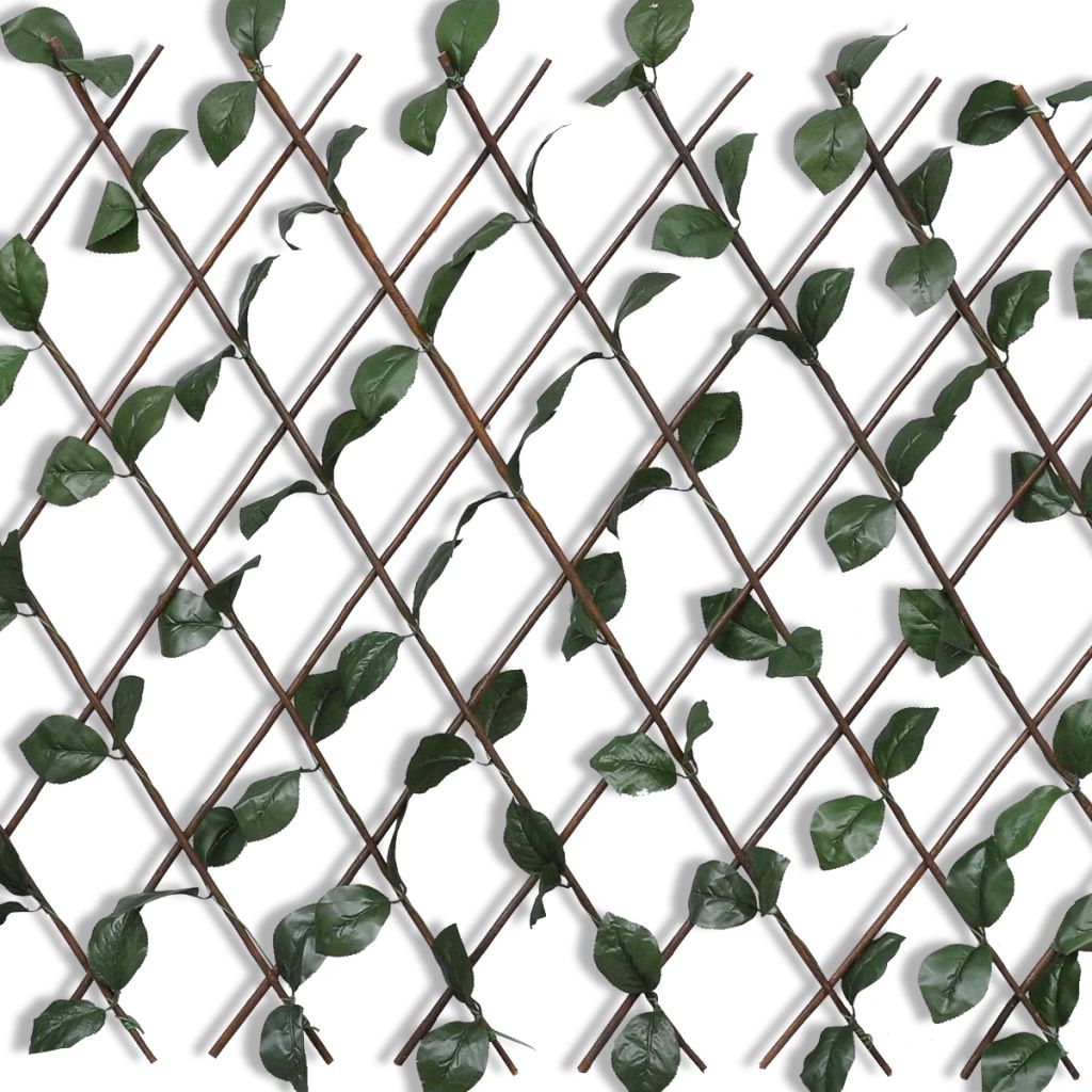 Dieses ausziehbare Weidengitter kann im Außenbereich eine Vielzahl von Aufgaben erfüllen, z. B. als Einzäunung Ihres Grundstücks, Einsperren bzw. Fernhalten von Haustieren oder einfach nur zur Erschaffung von mehr Privatsphäre. Dieser 90 cm hohe Zaun kann bis zu 180 cm lang werden. Dieser hochwertige Gitterzaun aus witterungsbeständiger Weide eignet sich perfekt für die visuelle Abgrenzung von Gartenbereichen. Der Weidengitterzaun mit 86 künstlichen Blättern verleiht Ihrem Außenbereich eine besondere Note. Im Lieferumfang sind 5 Stk. enthalten.