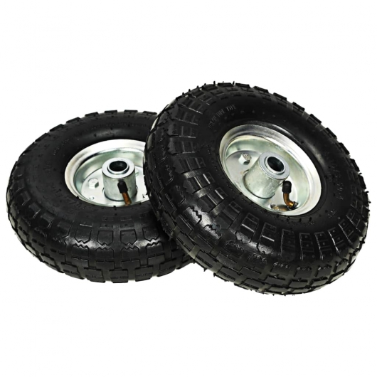 Die pannensicheren Karren-Ersatzräder eignen sich ideal, um Lasten mit Ihren Sackkarren, Handkarren, Transportwagen, Rollwagen, Dollies, Schubkarren, usw. selbst auf unebenen Böden zu bewegen. Die Luftreifen bestehen aus langlebigem, abriebfestem Gummi und verfügen über ein besonderes Laufflächenprofil, dass für zusätzlichen Halt bei höheren Geschwindigkeiten sorgt. Die Felgen sind aus robustem Metall gefertigt. Die Ersatzräder kommen in universaler Größe und lassen sich daher ganz leicht an Ihren Sackkarren, Wagen, usw. anbringen. Lieferung umfasst 2 Reifen.