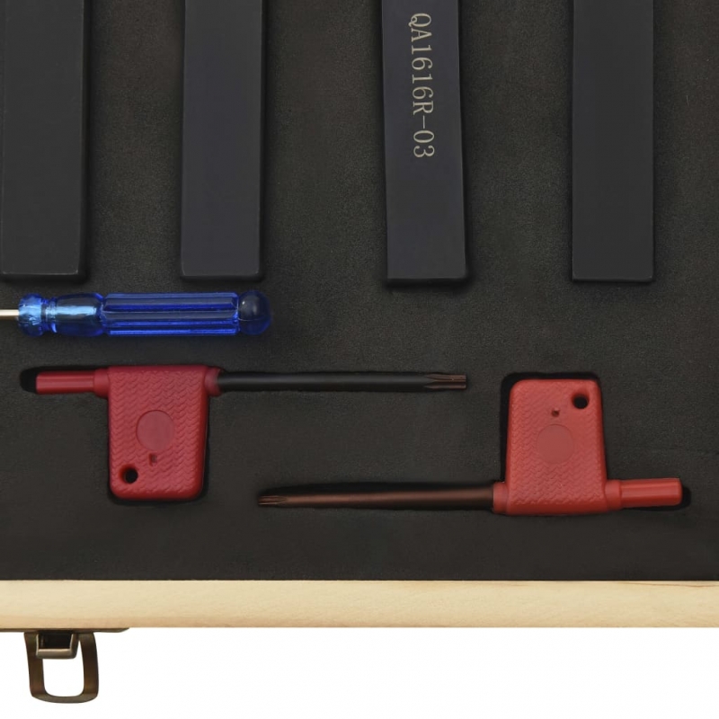 Dieses Set von 16-mm-Drehmeißeln besteht aus verschiedenen Werkzeugen zum Drehen, Schneiden und Gewindeschneiden. Diese Hartmetallschneiden eignen sich zum Drehen von Stahl und Stahllegierungen. Es ist ein ideales Werkzeugset für die Drehmaschine. Diese Werkzeuge bestehen aus Kohlenstoffstahl und Hartmetall und bieten eine hohe Härte und Belastbarkeit. Die Halter verfügen über eine glatte Oberfläche mit schwarzer Oxid-Beschichtung, auf die die jeweiligen Schaftgöße und Halterart gekennzeichnet sind. Die Wendeschneidplatte jedes Werkzeugs ist austauschbar und indexierbar. Die austauschbaren Schlüssel sind auch mit dabei. Das Drehmeißel-Set wird in einer Box zur einfachen Lagerung und zum Transport geliefert.