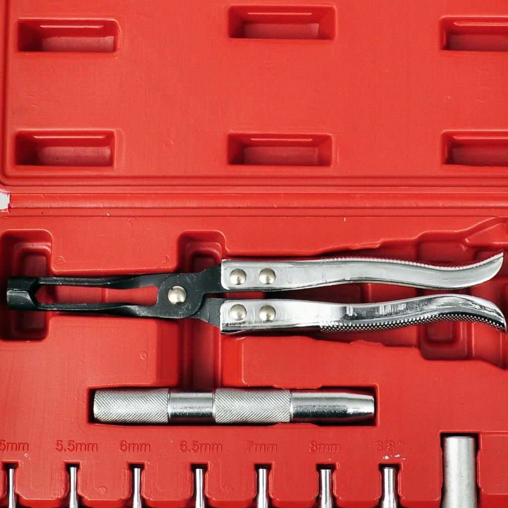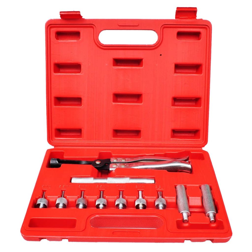 Dieses Werkzeug-Set zur Montage und Demontage von Ventilschaftdichtungen ist sowohl für Profis als auch für Heimwerker geeignet. Die Zange kann mit ihren langen Griffen bis in enge, schwer zugängliche Stellen gelangen. Die Rillen an den Spitzen und die Verzahnungen sorgen für einen leichten und festen Halt. Die gerändelten Griffe bieten außerdem rutschfeste, sichere Handhabung, sodass Sie sich selbst bei öligen Bedingungen keine Sorgen machen müssen, dass die Zange abrutscht. Die präzisionsgefertigte Spitze gewährleistet die richtige Montage jeder Dichtung. Die Buchsen und Adapter werden sich bei der Aus- und Einbau von Ventilschaftdichtungen als äußerst nützlich erweisen. Alle 11 Teile sind aus hochwertigem Carbonstahl gefertigt. Die Lieferung umfasst 1 x Zange für Ventilschaftdichtungen, 1 x Griff, 2 x Buchsen und 7 x Adapter; alle in einem blasgeformten Koffer für guten Schutz und einfachen Transport.