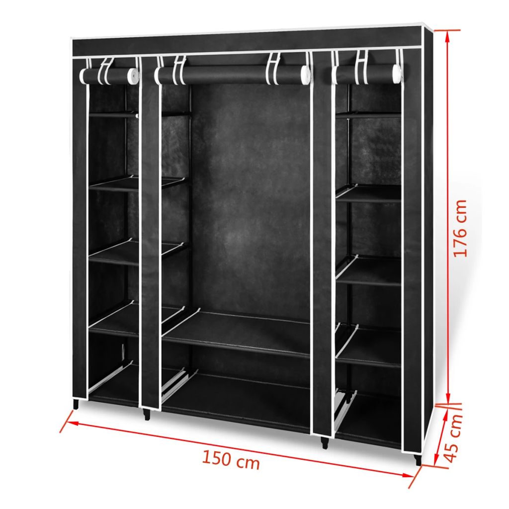 Dieser tragbare Faltschrank schützt Ihre Kleidung und Schuhe vor Staub und Schmutz im Keller, Kinderzimmer, Schlafzimmer, auf dem Dachboden oder beim Campen. Dieser Stoffschrank ist mit verschiedenen Fächern und Stangen versehen. Die aufrollbare Türen können mit Klettverschluss und Reißverschlüssen leicht geöffnet und geschlossen werden. Der faltbare Kleiderschrank ist aus widerstandsfähigem Vliesstoff und feuchtigkeitsbeständigen Eisenstangen gefertigt. Dadurch ist er langlebig, platzsparend und einfach zu montieren. Bitte drehen Sie die Eisenstange langsam in das Verbindungsstück, anstatt sie direkt in das Gelenk einzudrücken, während sie die Eisenstange mit den Kunststoffarmaturen verbinden.