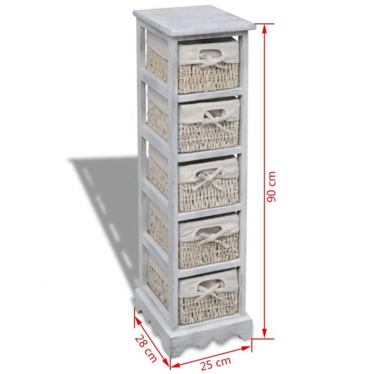Dieses beeindruckende Schränkchen aus hochwertigem Holz verfügt über ein schlichtes und zugleich elegantes Design. Es ist eine großartige Aufbewahrungslösung und zugleich ein tolles Raumdekoelement. Dieser robuste, kleine Beistellschrank mit 5 Körben bietet viel Platz zum Verstauen deiner Sachen und verleiht jedem Zimmer gleichzeitig einen Hauch von Landhausstil. Das Korb-Regal wird sicherlich eines deiner Lieblingsmöbel werden. Achtung: Um ein Umkippen zu vermeiden, sollte dieses Produkt mit der mitgelieferten Wandhalterung gesichert werden.