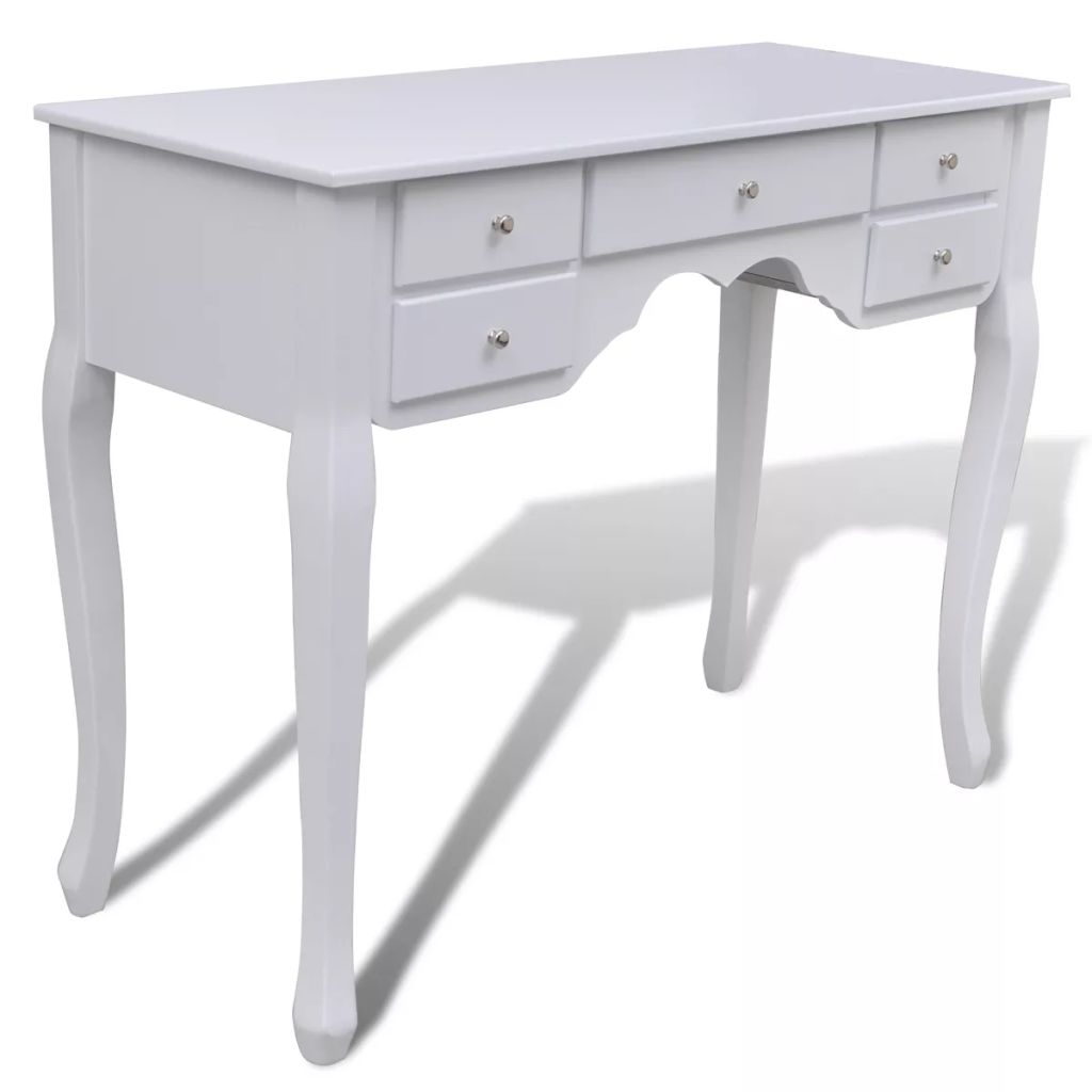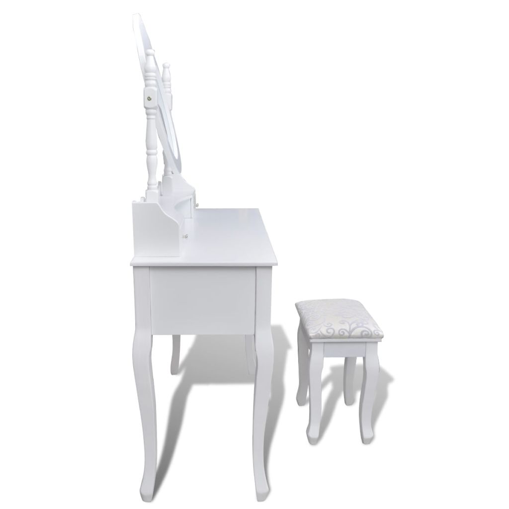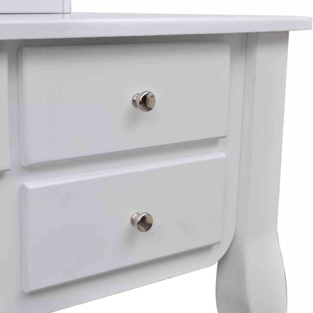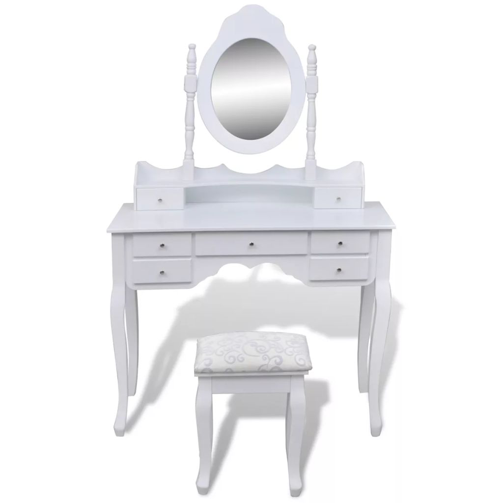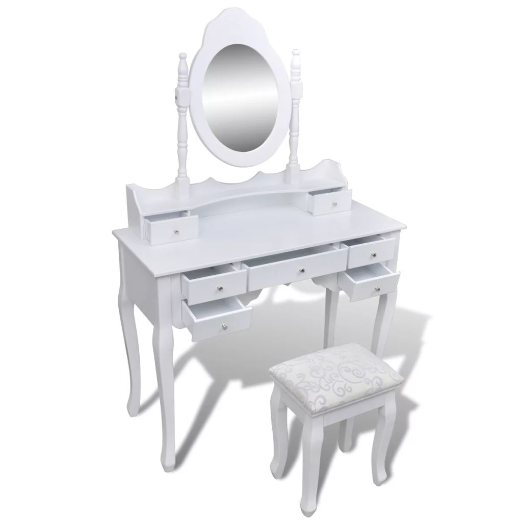 Dieser charmante Schminktisch und Hocker in XXL-Größe sind aus hochwertigem Kiefernholz gefertigt. Der viktorianische Stil und die saubere, weiße Farbe verleihen Ihrem Schlaf- oder Ankleidezimmer Eleganz und Schönheit. Das Schminktisch-Set zeichnet sich durch eine exquisite Verarbeitung aus. Der Spiegel hat einen freistehenden Rahmen, so dass Sie ihn in die gewünschte Position kippen können. Was aber als Überraschung gelten darf, ist, dass der Spiegel und Tisch voneinander getrennt verwendet werden können. Sieben schicke Schubladen bieten Ihnen zusätzlichen Stauraum für Ihren Schmuck, Kosmetika und andere Wertsachen. Dieser Frisiertisch mit Hocker wird überall zum Hingucker sein. Der Zusammenbau ist recht einfach mit dem im Lieferumfang enthaltenen Montagesatz.