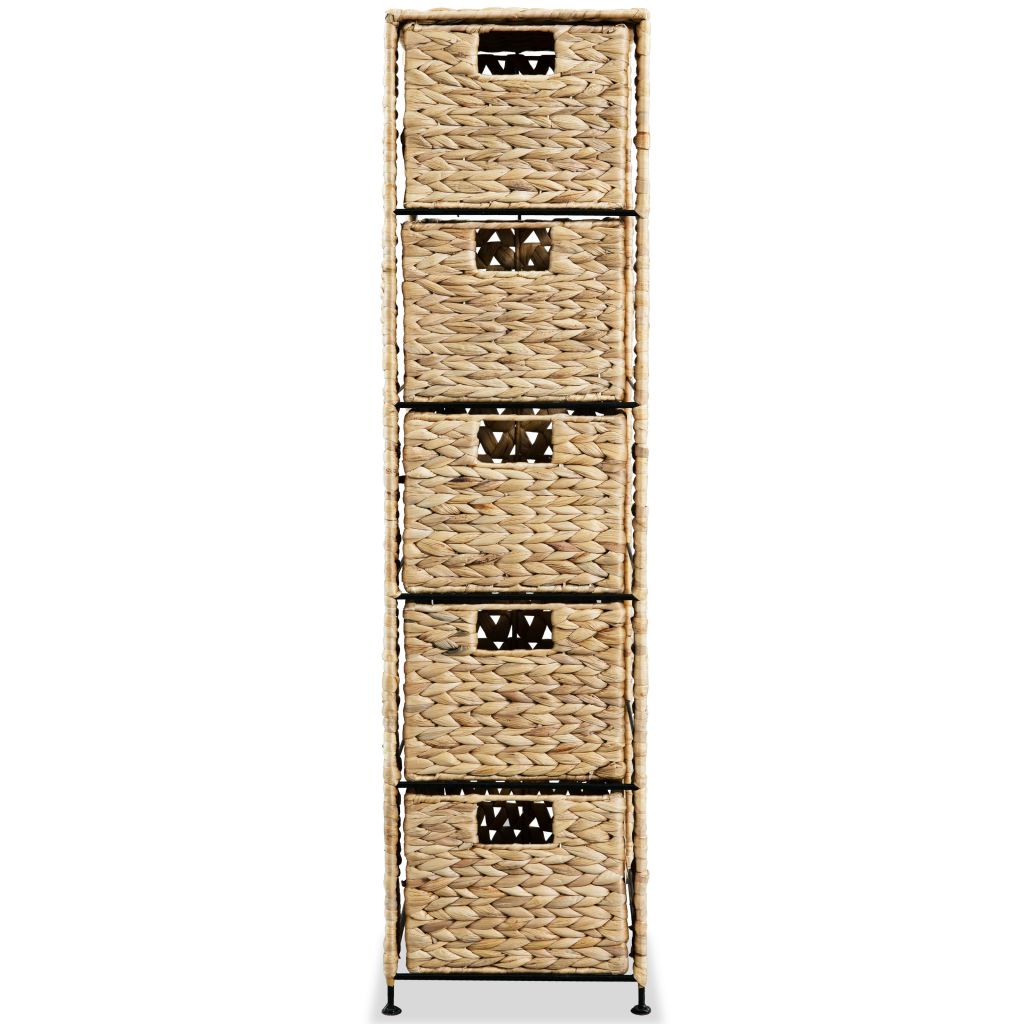 Dieser praktische Schubladenschrank bietet eine perfekte Aufbewahrungslösung und nimmt kaum Platz in Anspruch. Die 5 Schubladen bieten reichlich Stauraum für die unterschiedlichsten Sachen. Mit einem Metallgestell und Körben aus Wasserhyazinthe versehen, ist das Standregal sehr robust und haltbar. Die optisch ansprechende Weberei trägt zum rustikalen Charme des Schranks bei.