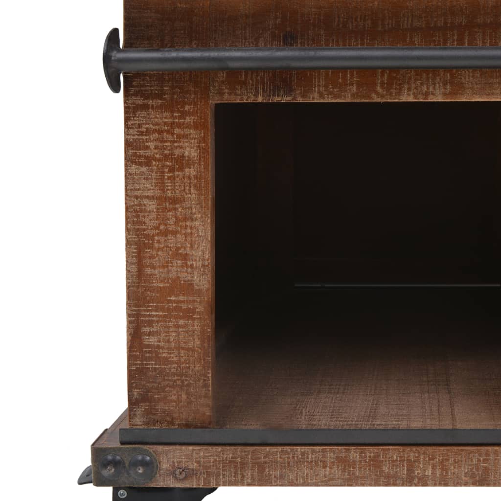 Dieser klassische Couchtisch aus Holz ist eine dekorative Ergänzung zu deinem Wohnzimmer. Er lässt sich auch als Beistelltisch, Kaffeetisch oder Wohnzimmertisch verwenden. Dieser äußerst stabile und langlebige Beistelltisch ist aus massivem Tannenholz gefertigt. Er strahlt daher einen Vintage-Charme aus und weist eine rustikale Optik auf. Die robuste Oberplatte bietet den idealen Platz für Obstkörbe, Vasen oder andere dekorative Gegenstände. Der Couchtisch schafft auch Stauraum, um verschiedenen Sachen ordentlich aufzubewahren. Das Hängetür-Design ermöglicht ein einfaches Öffnen und Schließen der Tür und trägt zum Vintage- und Industrie-Stil des Tisches bei. Der Tisch ist mit vier flexiblen Rollen ausgestattet und lässt sich daher mühelos umher verschieben. Dieser Couchtisch lässt sich einfach zusammenbauen.