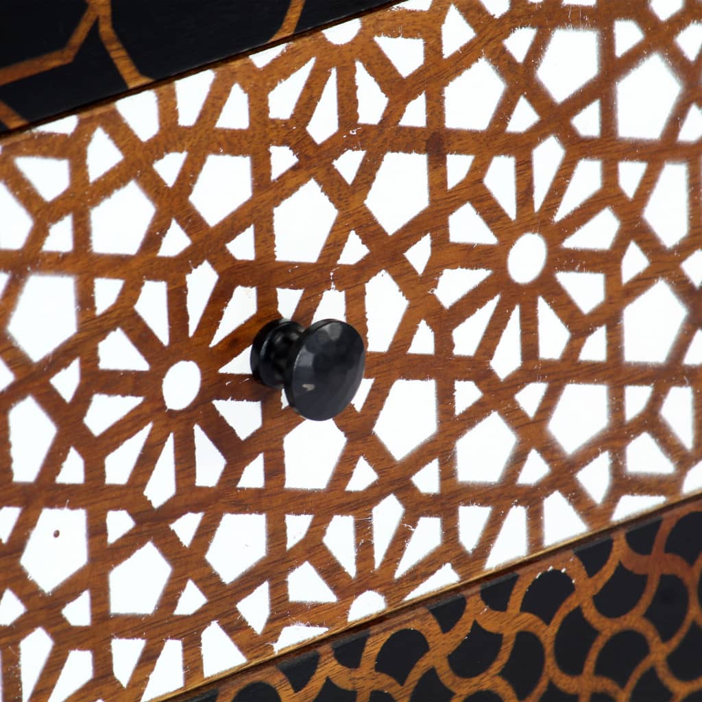 Bringe den Luxus der Mid-Century-Moderne in dein Interieur mit diesem optisch ansprechenden Beistellschrank aus Holz! Mit 6 Schubladen versehen, schafft das Sideboard reichlich Stauraum und ist daher sowohl eine praktische als auch eine dekorative Ergänzung zu deinem Wohnraum. Das Sideboard ist aus massivem Mangoholz gefertigt, das poliert, angestrichen und lackiert wurde, um eine raffinierte Optik aufzuweisen. Mangoholz ist ein dichtes und robustes Hartholz, das schöne braune oder goldene Streifen und Konturen auf seiner Oberfläche aufweist. Die schönen Druckmuster auf den Schubladenfronten tragen zum ansprechenden Design des Beistellschranks bei. Darüber hinaus lässt sich das Sideboard einfach zusammenbauen und mit einem feuchten Tuch leicht reinigen. Werte also dein Interieur mit diesem eleganten Schubladenschrank auf! Wichtiger Hinweis: Die exquisite Handwerkskunst und die anmutige Holzmaserung machen jedes Möbelstück zu einem Unikat. Die Lieferung erfolgt in zufälliger Reihenfolge, was die Exklusivität und Individualität deines Produkts gewährleistet.