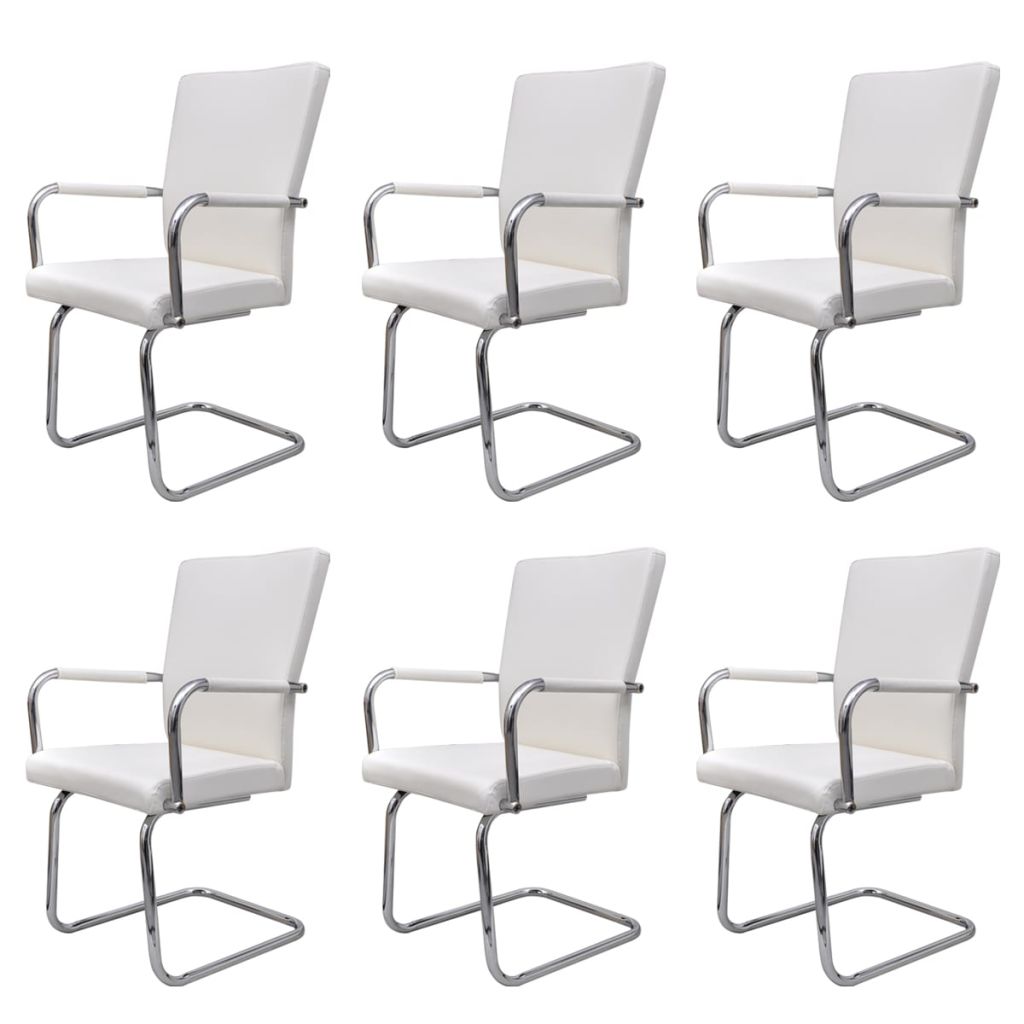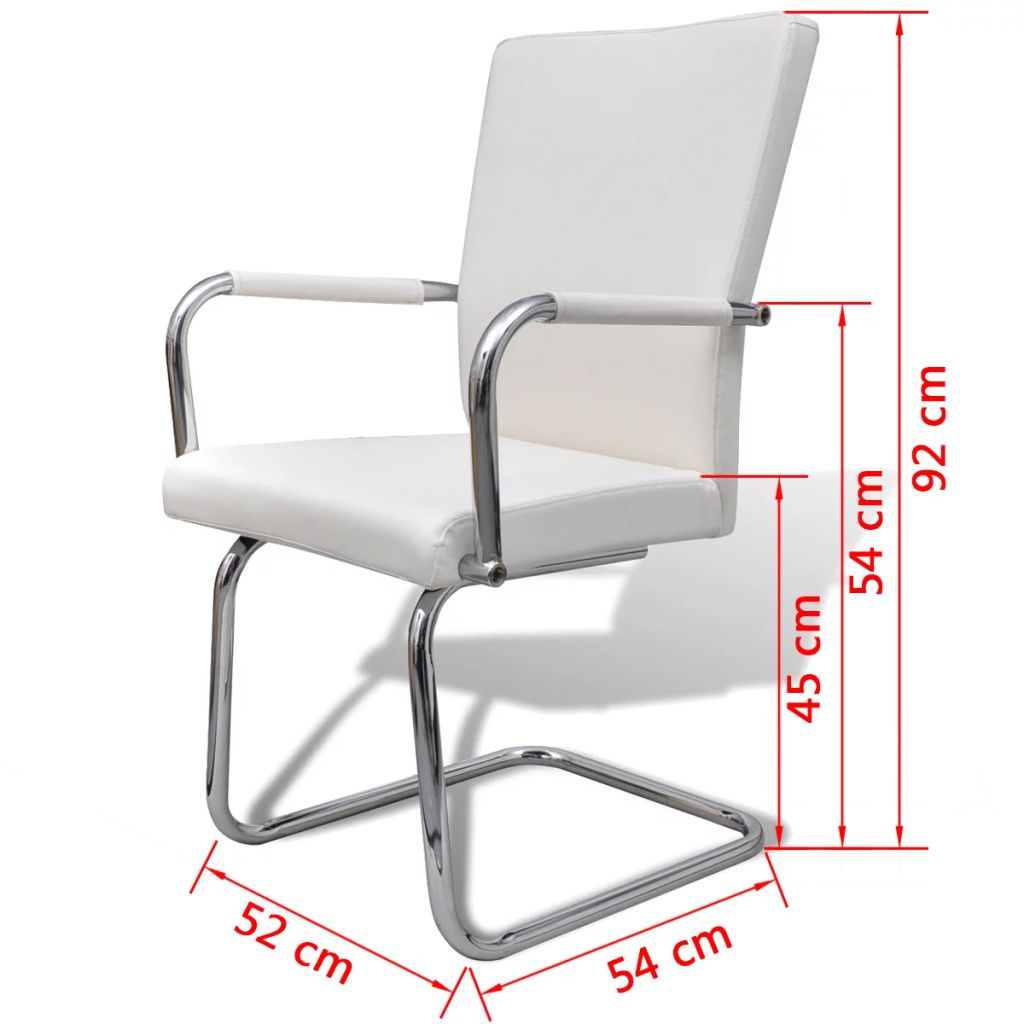 Dieses Set umfasst 6 Freischwinger aus Kunstleder, die durch ihr ästhetisch ansprechendes und ergonomisches Design überall ein auffälliges Statement setzen. Der bequeme Esszimmerstuhl weist eine hochwertige und robuste Konstruktion auf. Die Stuhlbeine sind aus stabilem Eisen hergestellt und bieten sehr hohe Stabilität. Sie lassen sich außerdem leicht reinigen. Die dick gepolsterten und mit Kunstleder bezogenen Sitzfläche und Rückenlehne werden Ihnen optimalen Sitzkomfort bieten. Die langlebige, robuste Konstruktion des Stuhles sorgt für eine lange Lebensdauer. Die Lieferung umfasst 6 weiße Stühle.
