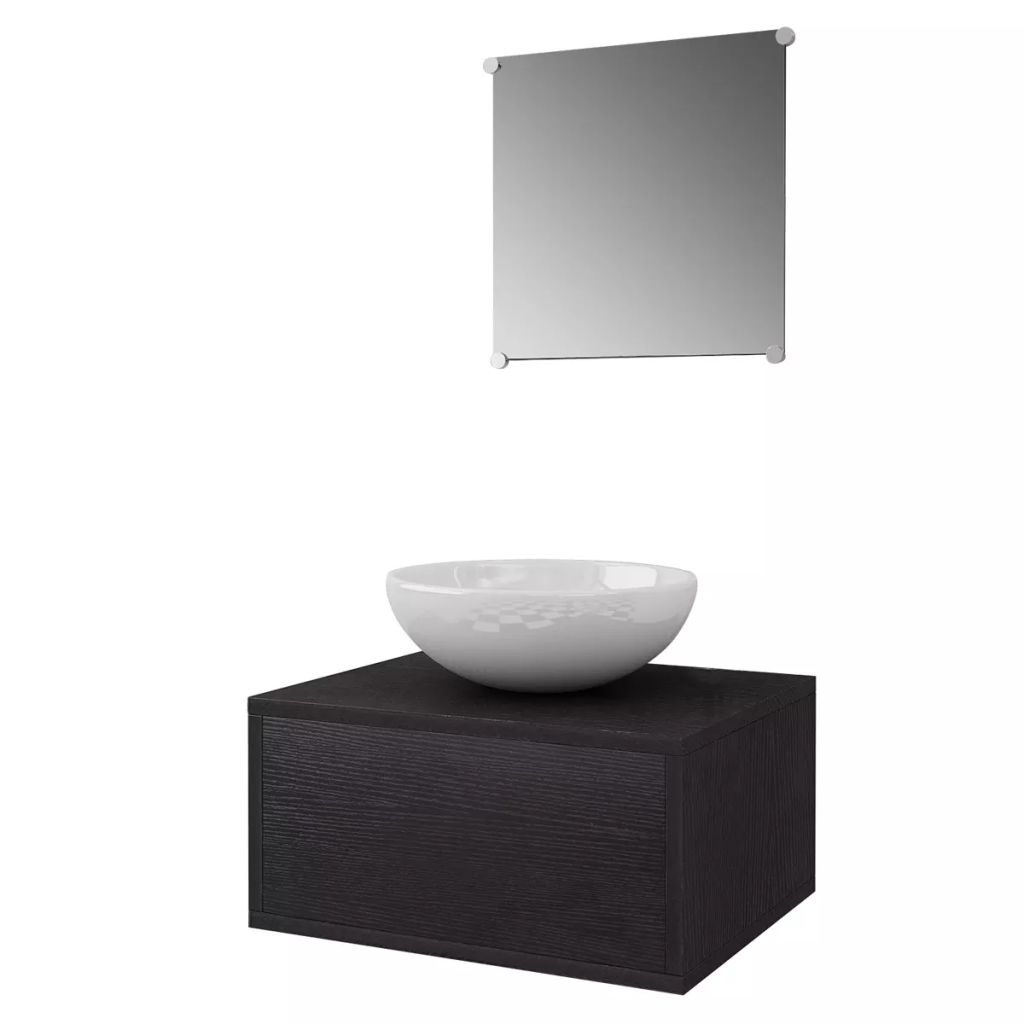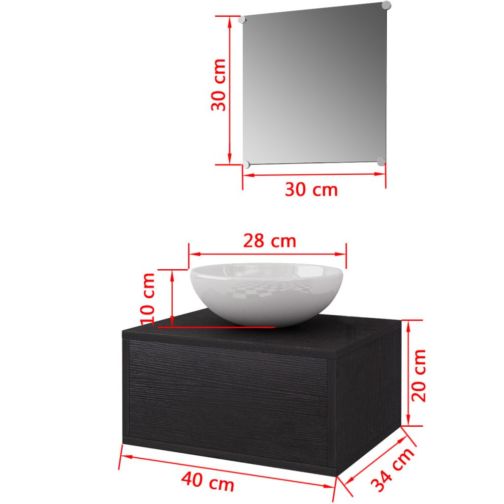 Dieses komplette Set, bestehend aus 1 Wand-Waschtisch, 1 Spiegel und 1 Waschbecken, wird eine große Ergänzung zu Ihrem Badezimmer, die Optimierung Ihres Raumes ohne Kompromisse bei Stil. Das Badmöbelset besteht aus einem Spiegel und einem Waschbeckenschrank. Die kompakte Größe und das minimalistische Design machen es eine hervorragende Ergänzung zu jedem modernen Badezimmer. Aus hochwertigem Holzwerkstoff ist diese Waschtischunterschrank sehr stabil und langlebig. Das Becken besteht aus hochwertiger Keramik, die kratzfest, korrosionsbeständig und leicht zu reinigen ist. Es ist geeignet, über der Arbeitsplatte montiert werden. Montage ist wirklich einfach. Die Lieferung beinhaltet auch einen Pop-up Ablassschraube und Montagezubehör. Bitte beachten: Der Wasserhahn ist nicht im Lieferumfang enthalten; Das Loch für den Wasserhahn ist nicht vorgebohrt.