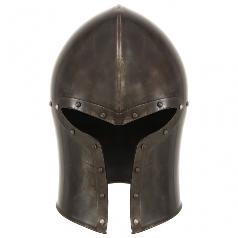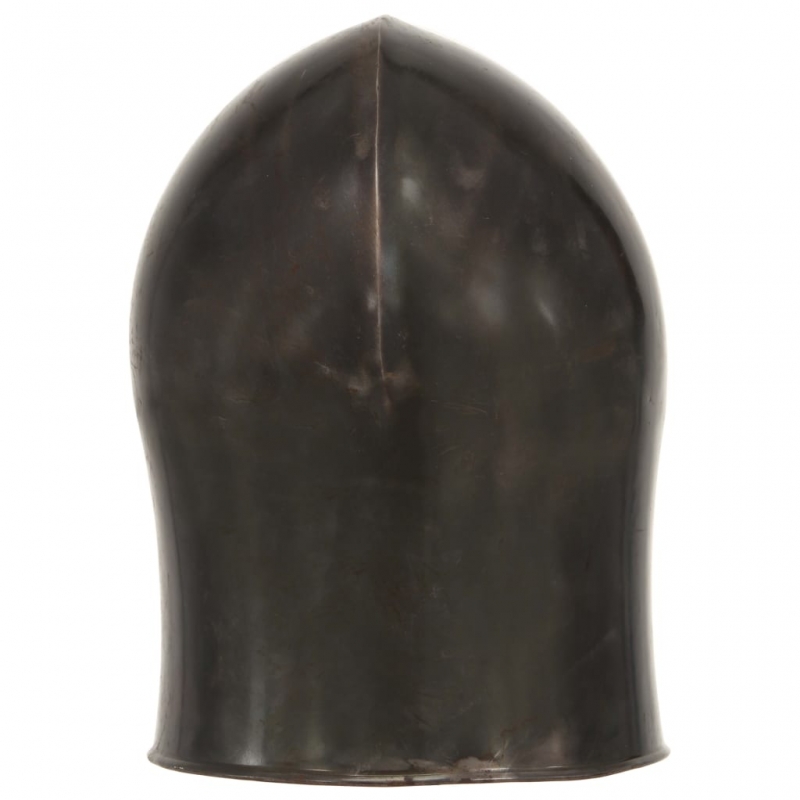 Dieser Rüstungshelm in Antik-Optik eignet sich hervorragend für LARP (Live-Action-Rollenspiel), Cosplay, Partys mit historischem Thema, Halloween-Party, Theaterrequisiten und historische Nachstellungen (Reenactments). Der Helm ist eine exakte Nachbildung eines original mittelalterlichen Barbuta-Ritterhelms. Gefertigt aus Stahl der Stärke 18, kombiniert er antiken Stil und robustes Material zu einem eindrucksvollen Helm, der perfekt zu Ihrer Ritterrüstung passt. Dieser Helm weist ein offenes Design in T-Form auf, wobei nur Augen, Nase und Mund unbedeckt bleiben. Darüber hinaus ist er auch ein attraktives Ausstellungsstück.