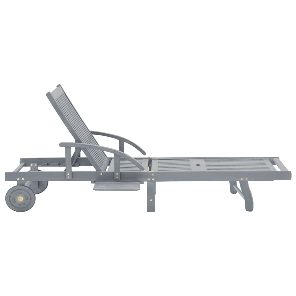 Entspannen und erholen Sie sich in Ihrem Garten oder Ihrer Terrasse auf dieser bequemen Sonnenliege aus Holz! Verbringen Sie einen entspannten Nachmittag in Ihrem eigenen Outdoor-Wohnbereich. Die Relaxliege ist perfekt für den Balkon, Garten, Pool usw. Diese Garten-Sonnenliege besteht aus massivem Akazienholz mit grauem Finish und ist daher robust und stabil. Die Rückenlehne und die Fußstütze sind verstellbar, und außerdem können Sie die Liege in der gewünschten Position arretieren. Diese Garten-Sonnenliege kann dank der 2 Räder leicht umstellt werden. Die Sonnenliege verfügt über eine praktische ausziehbare Ablage, auf der Sie Ihr Telefon, Ihre Sonnenbrille, Getränke und andere kleine Gegenstände aufbewahren können. Das Kissen bietet zusätzlichen Komfort beim Entspannen. Jede Auflage verfügt über zwei Sets Bänder, mit denen sie sicher auf der Sonnenliege befestigt werden kann. HinweisUm die Lebensdauer Ihrer Gartenmöbel zu verlängern, empfehlen wir Ihnen, diese regelmäßig zu reinigen und bei Nichtgebrauch, wenn im Freien, abzudecken.Reinigung:Verwenden Sie eine milde SeifenlösungLagerung:Wenn möglich, an einem kühlen, trockenen Ort im Innenbereich lagern. Wenn das Produkt im Freien gelagert wird, schützen Sie es mit einer wasserdichten Abdeckung. Wischen und trocknen Sie das überschüssige Wasser oder den Schnee, nach Regen oder Schneefall. Sorgen Sie für eine ausreichende Luftzirkulation, um feuchtigkeitsbedingte Schäden zu vermeiden.