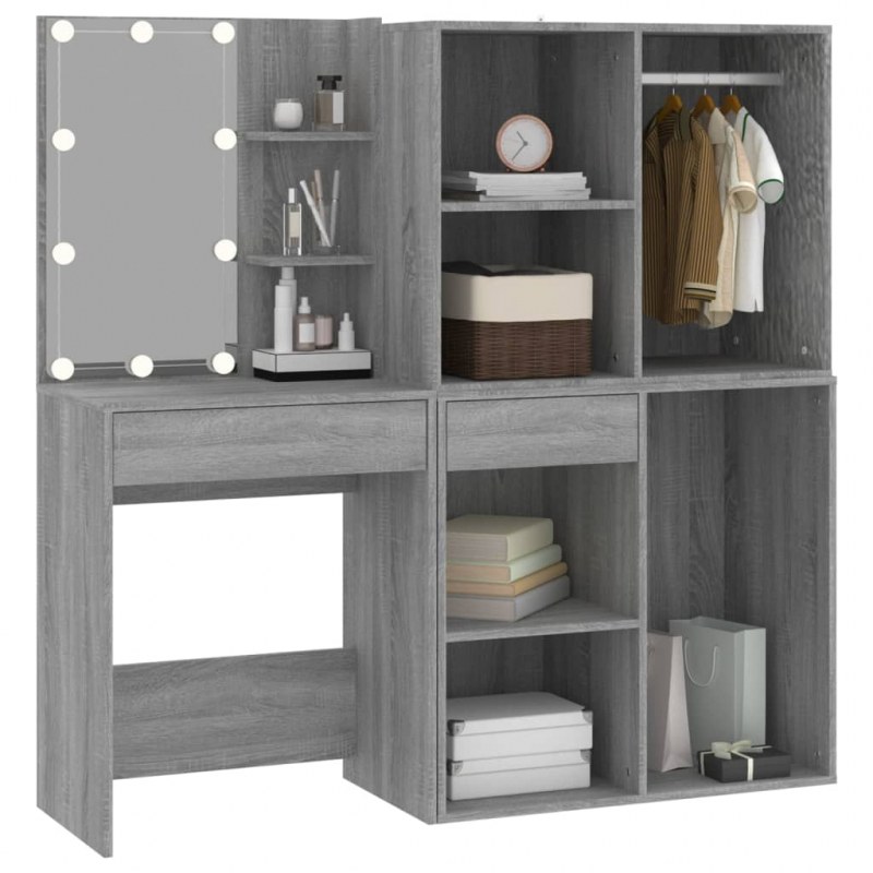 Der trendige LED-Schminktisch mit Schränken verleiht deinem Schlafzimmer einen zeitlosen, eleganten Look. Er ist eine perfekte Ergänzung zu deinem Schlafzimmer, da sich darin deine Kosmetika griffbereit aufbewahren lassen! Stabiles Material: Holzwerkstoff ist ein Material hoher Qualität mit glatter Oberfläche, das sich durch Festigkeit, Stabilität und Feuchtigkeitsbeständigkeit auszeichnet.Allzweckspiegel: Der Schminktisch mit Spiegel eignet sich perfekt für deine tägliche Schönheitsroutine. Dabei ermöglicht der Spiegel eine optimale Gesichtspflege und auch das Auftragen von Make-up!LED-Beleuchtung: Der Schminktisch mit Stauraum verfügt über LED-Leuchten mit USB-Anschluss, die sich leicht von Warm- auf Kaltweiß umschalten lassen. Die LED-Glühbirnen um den Spiegel beleuchten dein Gesicht optimal.Viel Stauraum: Der LED-Schminktisch bietet reichlich Platz, um Make-up, Schmuck und wichtige Alltagssachen griffbereit aufzubewahren.Vielseitig einsetzbar: Dieses Schminktisch-Set eignet sich für verschiedene Bereiche, sei es Schlafzimmer, Ankleide oder jeden anderen Raum, in dem du es aufstellen möchtest. ACHTUNG:Um das Umkippen zu verhindern, muss dieses Produkt mit der mitgelieferten Wandhalterung gesichert werden. Hinweis:Jedes Produkt wird mit einer Montageanleitung in der Verpackung für eine einfache Montage geliefert.