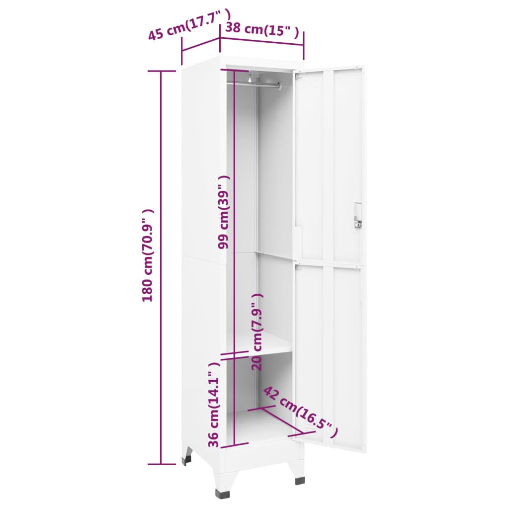 Mit seinem modernen Design stellt dieser Schließfachschrank eine großartige dekorative Ergänzung zu jedem Raum oder Bürobereich dar. Dieser Lagerschrank ist aus Stahl gefertigt, was ihn langlebig und leicht zu reinigen macht. Der Spind ist mit einer Kleiderstange, einem Regalboden, einer abschließbaren Tür und Lüftungsschlitzen ausgestattet. Der Schrank bietet reichlich Stauraum zur sicheren Aufbewahrung von Kleidung und anderen persönlichen Gegenständen. Darüber hinaus lassen sich Ihre Sachen dank der Namensschildhalter übersichtlich aufbewahren. Dieser Schrank eignet sich für Schulen und Büros zur Aufbewahrung verschiedener Sachen.