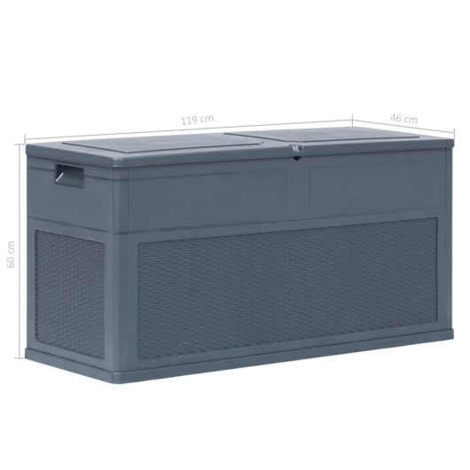 Diese stilvolle Aufbewahrungsbox ist eine ideale Lösung, um dein Zuhause zu entrümpeln. Halte deinen Outdoor-Wohnbereich aufgeräumt, indem du deine Kissen, Auflagen, Decken und andere Gegenstände außer Sichtweite aufbewahrst. Dank ihrer soliden Konstruktion kann die Box auch als Werkzeugkasten verwendet werden. Der strapazierfähige, witterungsbeständige Kunststoff, aus dem diese Outdoor-Box gefertigt ist, macht sie sowohl für den Innen- als auch für den Außenbereich geeignet. Durch das schlichte und doch klassische Design fügt sich die Gartenbox in jede Umgebung gut ein. Die Aufbewahrungstruhe ist leicht zu montieren.