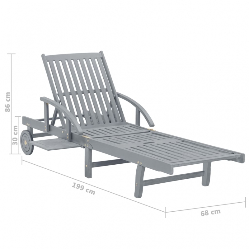 Entspanne dich im Garten oder auf der Terrasse auf dieser bequemen Sonnenliege aus Holz! So kannst du einen entspannten Nachmittag in deinem eigenen Außenbereich verbringen. Die Gartenliege findet den perfekten Platz neben dem Pool, auf dem Balkon, der Terrasse, im Garten usw. Diese Gartenliege besteht aus langlebigem Akazienholz, das mit einer grauen Lackierung versehen wurde und sich durch eine ausgezeichnete Witterungsbeständigkeit kennzeichnet. Die breiten Armlehnen, die hohe Rückenlehne und die konturierte Sitzfläche tragen nicht nur zur ansprechenden Optik bei, sondern sorgen auch für höchsten Sitz- oder Liegekomfort. Rückenlehne und Fußteil sind verstellbar, sodass du die Liege in der gewünschten Position arretieren kannst. Mit 2 Rädern versehen, lässt sie sich mühelos umher verschieben. Sie lässt sich auch einfach reinigen und pflegen.