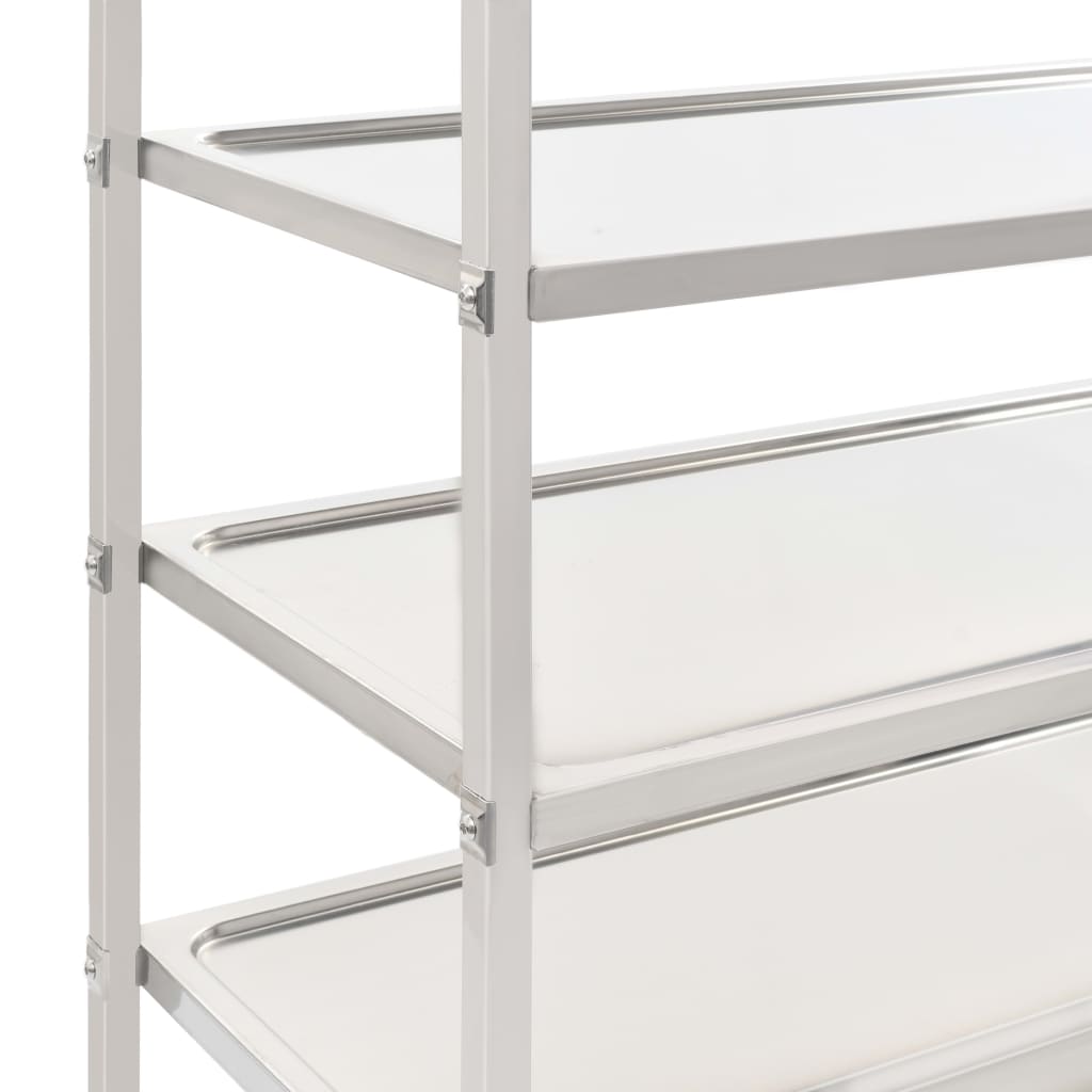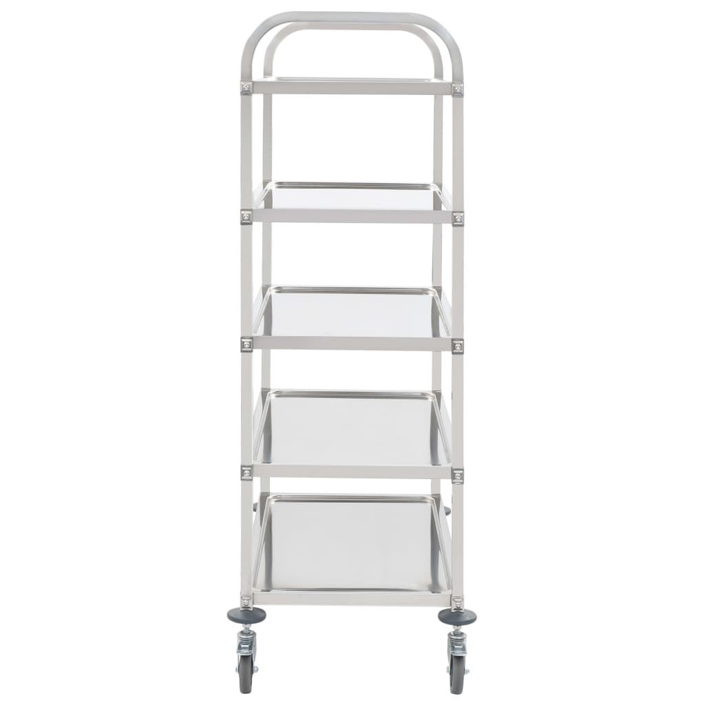 Dieser Küchenwagen mit 5 Ebenen ist aufgrund seiner robusten Konstruktion ein praktischer Helfer in der Küche oder auf Partys. Sie können damit ganz einfach Speisen und Getränke servieren oder Geschirr in die Küche transportieren. Die großen Tabletts bieten ausreichend Platz, um Speisen und Getränken zur Schau zu stellen. Der Edelstahlrahmen hält den Servierwagen auch bei Volllast stabil und robust. Dank der leichtgängigen Rollen lässt sich der Wagen mühelos und leise verschieben. Darüber hinaus sind zwei der Rollen mit Bremsen ausgestattet, um das Wegrollen des Wagens zu verhindern. So können Sie ihn auch verwenden, um Werkzeuge oder andere alltägliche Haushaltsgegenstände aufzubewahren. Der Küchenwagen ist einfach zu montieren.