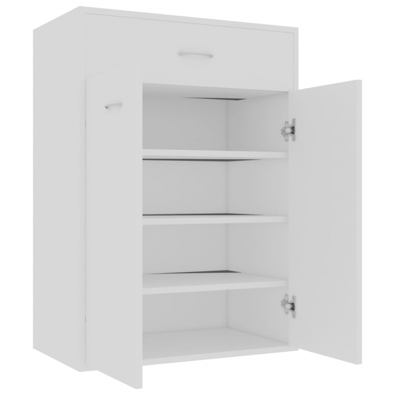 Halten Sie Ihre Schuhe organisiert und immer griffbereit mit diesem Schuhständer! Dieses Regal ist aus hochwertigem Holzwerkstoff gefertigt, das langlebig und robust für eine lange Lebensdauer ist. Es weist ein schlichtes Design auf, das sich stilistisch in jeden Wohnraum einfügt. Mit einer Schublade, 2 Türen und 4 Regalböden im Inneren bietet dieses Gestell viel Platz für Schlüssel, Schuhe, Aufbewahrungsboxen und Dekorationsgegenstände wie Vasen. Das Wandmontagezubehör und der Wandanker gegen ein Umkippen sind im Lieferumfang mit enthalten. Der Schrank lässt sich zudem leicht mit einem feuchten Tuch reinigen und einfach montieren.