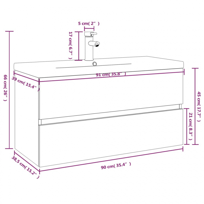 Dieser stilvolle Badezimmerschrank mit Einbaubecken bietet viel Stauraum und ist eine ausgezeichnete Ergänzung zu deinem Badezimmer, da er für Ordnung sorgt und eine markante Optik aufweist! Robustes Material: Der Unterschrank besteht aus Holzwerkstoff, einem Material von außergewöhnlicher Qualität mit glatter Oberfläche, das sich durch Festigkeit, Stabilität und Feuchtigkeitsbeständigkeit auszeichnet.Viel Stauraum: Der Waschbeckenunterschrank verfügt über eine Schublade und bietet dadurch viel Stauraum für die Aufbewahrung verschiedener Sachen in deinem Badezimmer.Praktisches Design: Auf der Oberseite dieses Badschranks findet dein Waschbecken den idealen Platz.Wandmontage: Der Badezimmerschrank lässt sich an der Wand montieren, um zusätzlichen Stauraum zu schaffen. Auf diese Weise kannst du deine Stellfläche maximieren und leichter für Ordnung sorgen.Überlauffunktion: Ein Überlauf sorgt dafür, dass das Wasser abfließt, wenn das Waschbecken zu voll wird. Hinweis:Schrauben und Dübel für die Wandbefestigung sind nicht enthalten. Suchen und verwenden Sie die für Ihre Wände geeigneten Schrauben und Dübel. Wenn Sie unsicher sind, suchen Sie professionelle Hilfe. Lesen und befolgen Sie jeden Schritt der Anleitung sorgfältig.Der Wasserhahn und die Ablaufgarnitur sind nicht im Lieferumfang enthalten.Jedes Produkt wird mit einer Montageanleitung in der Verpackung für eine einfache Montage geliefert.Es handelt sich um eine Warm- und Kaltwasser-Armatur. Für Warmwasser ist der Anschluss eines Warmwasserbereiters erforderlich.