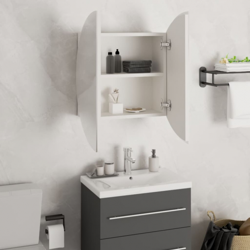 Mit diesem trendigen Badschrank mit rundem Spiegel und LED-Streifen kannst du deine Pflegeprodukte ordentlich aufbewahren! Langlebiges Material: Holzwerkstoff ist ein Material von außergewöhnlicher Qualität, das eine glatte Oberfläche aufweist und sich durch hohe Festigkeit, Robustheit und Feuchtigkeitsbeständigkeit auszeichnet. Aus Holzwerkstoff gefertigt, lässt sich dieser LED-Spiegelschrank einfach reinigen.Praktischer Spiegel: Der schöne Spiegel bietet eine klare Sicht beim Auftragen von Make-up und verleiht dem Badschrank eine elegante Note.LED-Leuchten: Der Wandschrank verfügt über einen LED-Streifen, der mit einer USB-Schnittstelle ausgestattet sind, was eine bequeme Bedienung gewährleistet.Viel Stauraum: Dieser Spiegelschrank verfügt über große Fächer, die reichlich Platz zur ordentlichen Aufbewahrung deiner Sachen bieten.Wandmontage: Dieser LED-Badschrank lässt sich an der Wand befestigen. Auf diese Weise kannst du deine Bodenfläche maximieren und für Ordnung im Raum sorgen. Hinweis:Jedes Produkt wird mit einer Montageanleitung in der Verpackung für eine einfache Montage geliefert.Schrauben und Dübel für die Wandbefestigung sind nicht enthalten. Suchen und verwenden Sie die für Ihre Wände geeigneten Schrauben und Dübel. Wenn Sie unsicher sind, suchen Sie professionelle Hilfe. Lesen und befolgen Sie jeden Schritt der Anleitung sorgfältig.Der USB-Anschluss und ein 5V USB-Adapter sind nicht im Lieferumfang enthalten.