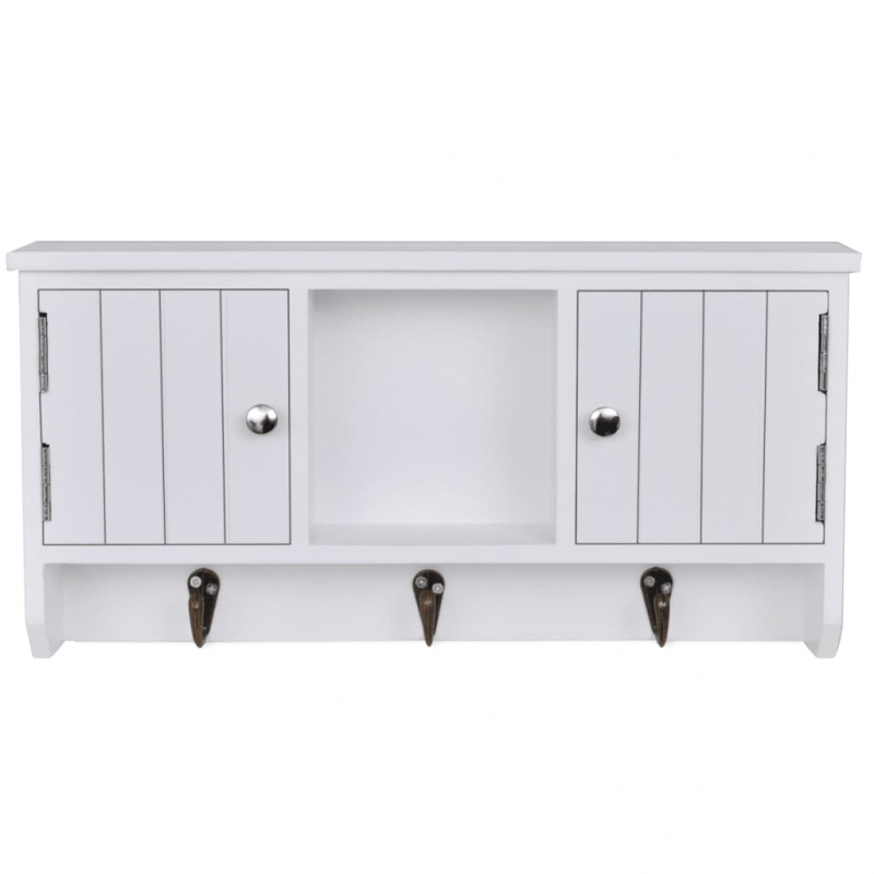 Dieser Schlüsselschrank in Altweiß mit schlichtem, aber elegantem Design ist eine ebenso dekorative wie praktische Ergänzung für deine Wohnungseinrichtung, da du darin deine Schlüssel und andere Dinge des täglichen Bedarfs gut organisiert aufbewahren kannst. Der Wandschrank zur Schlüsselaufbewahrung verfügt über drei Stahlhaken für deine Schlüssel. Die zwei Fächer mit Türen und die Ablage bieten viel Platz für die Aufbewahrung von Geld, Handys, Sonnenbrillen, Schmuck oder anderen Accessoires. Die MDF-Konstruktion macht den Schlüsselschrank solide und langlebig. Der Wandschrank für Schlüssel kann fest an der Wand befestigt werden. Dank der weißen Lackierung lässt er sich leicht mit einem feuchten Tuch sauber wischen.