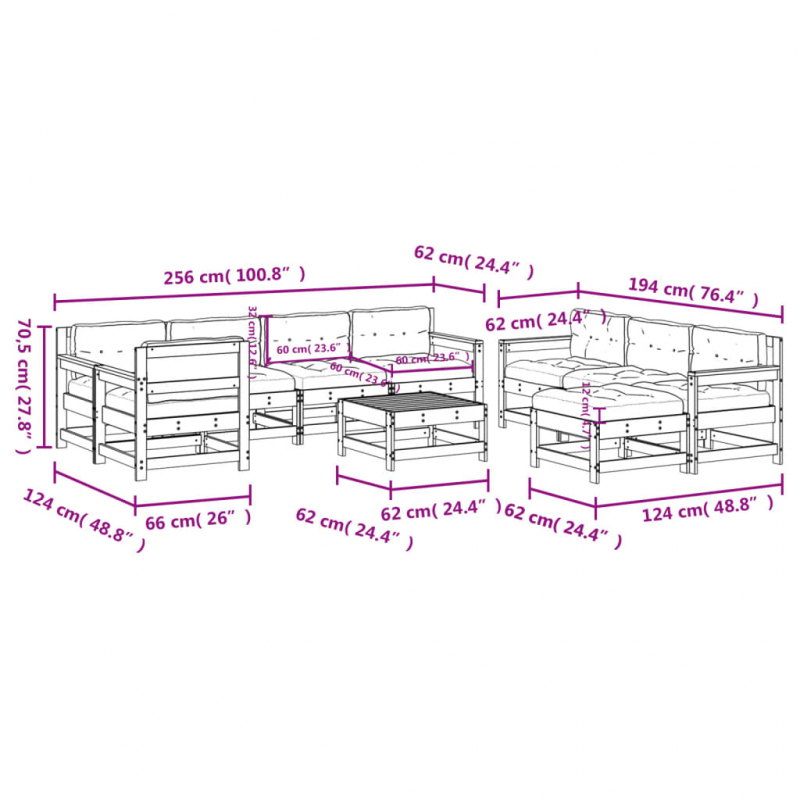 • Abmessungen des Mittelsofas: 62 x 62 x 70,5 cm (L x B x H)