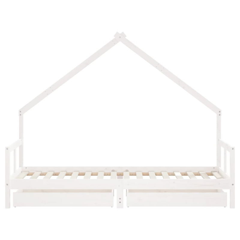Mit diesem fantastischen Kinderbett aus Holz bietest du deinen Kleinen einen eigenen lustigen Platz! Massives Kiefernholz: Das Kinderbett ist aus massivem Kiefernholz gefertigt. Massives Kiefernholz ist ein wunderschönes Naturmaterial. Kiefernholz weist eine gerade Maserung auf und die Aststellen verleihen dem Material seine charakteristische, rustikale Optik.Robuste Latten: Das Kinderbett ist mit Holzlatten versehen, die für einen festen Halt, Belüftung und Stabilität sorgen.Design in Hausform: Mit seinem coolen und doch schlichten Design macht dieses Kleinkinderbett das Schlafengehen zu einem lustigen Erlebnis. Es bietet viele Möglichkeiten zum Spielen und Aufbauen einer kleinen Kinderwelt, um Kreativität und Fantasie anzuregen.Mit Schubladen: Die mitgelieferten Schubladen bieten reichlich Platz für die Aufbewahrung von Kleinspielzeug, Kleidung und Bettzeug, um für Ordnung im Kinderzimmer zu sorgen.Durchdachtes Design: Dank der geringen Höhe des Einzelbettes können Kinder leicht ins Bett ein- und aussteigen.