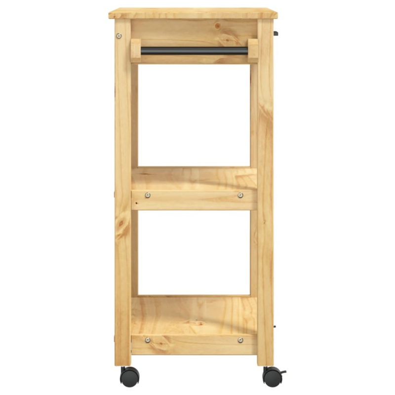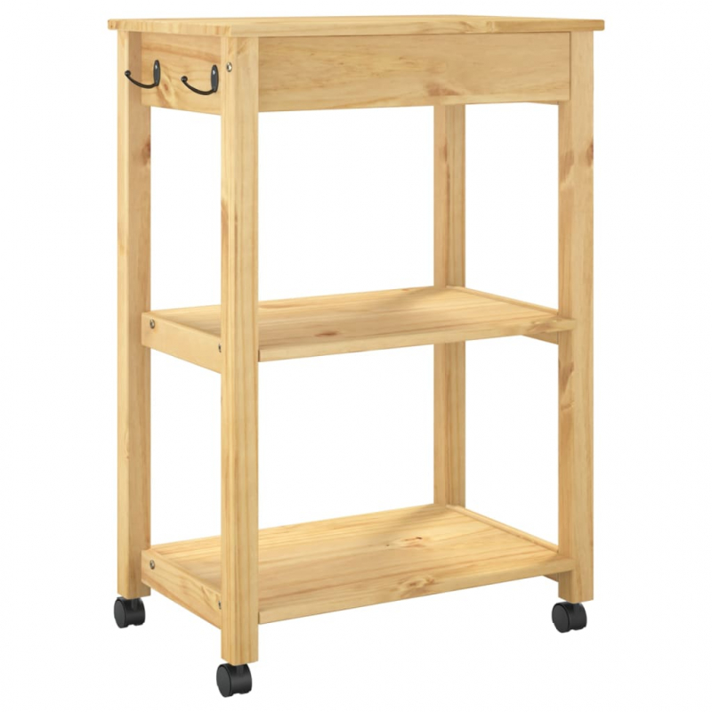 Dieser Küchenwagen aus Holz verleiht deiner Küche eine unverwechselbare Vintage-Note und schafft zusätzlichen Stauraum! Langlebiges Material: Kiefer-Massivholz ist ein wunderschönes Naturmaterial. Kiefernholz hat eine gerade Maserung und die Aststellen verleihen dem Material sein typisches, rustikales Aussehen. Aus Kiefer-Massivholz gefertigt, ist dieser Küchenwagen langlebig und robust. Viel Stauraum: Dieser Küchenwagen ist mit einer Schublade und 2 offenen Ablagen ausgestattet, die reichlich Stauraum für Küchenutensilien bieten. Auf der seitlichen Holzstange und den Metallhaken kannst du verschiedene Sachen griffbereit aufbewahren. Leicht zu bewegen: Dieser Servierwagen verfügt über 4 Räder, davon sind 2 feststellbar, sodass er sich jederzeit flexibel bewegen lässt und stabil steht. Vielseitige Anwendungsmöglichkeiten: Der Rollwagen kann in der Küche, im Wohnzimmer, im Badezimmer, im Arbeitszimmer und an anderen Orten verwendet werden. Du kannst hier deine Alltagsgegenstände, Gewürze, Toilettenartikel, Bücher und andere Dinge aufbewahren, um dein Zuhause aufgeräumt zu halten.