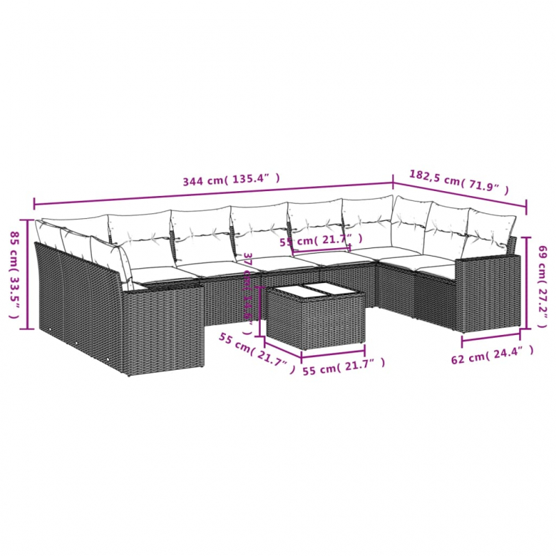 11-tlg. Garten-Sofagarnitur mit Kissen Grau Poly Rattan