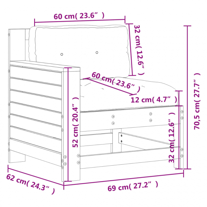 Dieses Gartensofa aus Holz mit Kissen ist eine großartige Ergänzung für deinen Garten, deine Terrasse oder deinen Innenhof. Auf diesem Gartenmöbel kannst du mit Familie und Freunden plaudern oder einfach nur das Wetter genießen. Imprägniertes Kiefernholz: Die Kesseldruckimprägnierung ist ein Konservierungsverfahren, das mit Hilfe von Autoklaven durchgeführt wird. Sie erhöht die Resistenz gegen Fäulnis und Witterung.Bequemes Sitzerlebnis: Die Rückenlehne und die Kissen bieten höchsten Sitzkomfort.Latten-Design: Das Latten-Design verhindert die Ansammlung von Wasser auf dem Gartenstuhl, hält die Sitzfläche trocken und verhindert Verrottung.Modulares Design: Das modulare Sofa lässt sich flexibel und einfach umstellen. Du kannst es mit anderen modularen Sofa-Elementen kombinieren, die im Dropdown-Menü zur Auswahl stehen, um dein persönliches Outdoor-Lounge-Set nach Belieben zu erstellen!Breite Anwendungen: Die Gartensessel eignet sich perfekt für jede Veranda, Terrasse, jeden Hinterhof, Rasen, Garten, usw. Gut zu wissen:Wir empfehlen dir, deine Gartenmöbel mit einer wasserdichten Hülle zu schützen, um lange Zeit eine ansprechende Optik aufzuweisen.