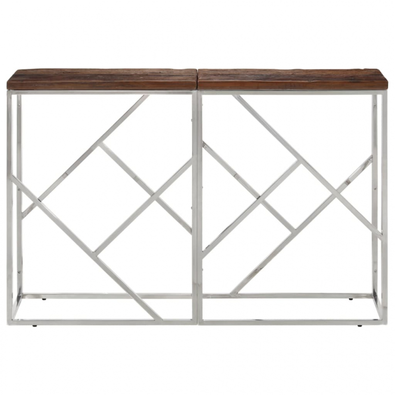 Dieser Konsolentisch vereint Funktionalität und Schönheit und wird der Mittelpunkt deines Zuhauses sein. Tischplatte aus massiven Holzschwellen: Die Tischplatte bietet reichlich Platz für Vasen, Topfpflanzen oder andere Dekoartikel.Robust und stabil: Das Edelstahlgestell verleiht dem Flurtisch Robustheit und Stabilität.Pflegeleicht: Dank seiner schmutzabweisenden Oberfläche lässt sich der Flurtisch leicht abwischen und reinigen, um stets brandneu auszusehen.Schlichtes Design: Der Konsolentisch weist ein schlichtes und modernes Design aus, das zu jeder Einrichtung passt.
