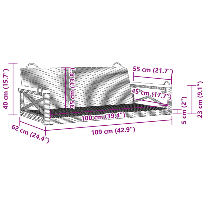 Diese Schaukelbank ist die perfekte Wahl, um dich in deinem Außenbereich zu entspannen. Langlebiges Material: PE-Rattan, auch als Poly Rattan bekannt, ist ein robustes, pflegeleichtes synthetisches Material, das die Optik von natürlichem Rattan aufweist. Es kennzeichnet sich durch ein geringes Eigengewicht und lässt sich einfach reinigen. Aufgrund seiner Haltbarkeit und Witterungsbeständigkeit wird es häufig bei der Herstellung von Gartenmöbeln verwendet.Schaukelfunktion: Erlebe höchste Entspannung und genieße die sanfte Schaukelbewegung und die Brise auf dieser Hängebank.Praktische Befestigungsringe: Die Hängebank ist mit Befestigungsringen ausgestattet und lässt sich bequem an großen Bäumen, Ständern und anderen stabilen Strukturen aufhängen.Robuster und stabiler Rahmen: Dank des pulverbeschichteten Stahlrahmens ist das Outdoor-Möbel robust, stabil und für den täglichen Einsatz im Außenbereich geeignet. Gut zu wissen:Wir empfehlen dir, deine Gartenmöbel mit einer wasserdichten Hülle zu schützen, um lange Zeit eine ansprechende Optik aufzuweisen.Die Lieferung umfasst nur die Schaukelbank. Das Schaukelgestell und die Aufhängeketten sind nicht inbegriffen.
