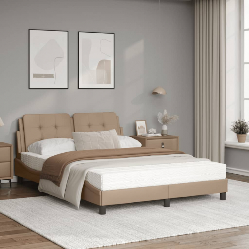 In diesem Bett mit Matratze genießt du einen besseren, erholsameren Schlaf! Es ist eine einladende Ergänzung zu jedem Schlafzimmer. Langlebiges Kunstleder: Hochwertiges Kunstleder ist ein äußerst langlebiges Material. Es ist schmutzabweisend und lässt sich mit einem feuchten Tuch einfach reinigen. Durch die glatte Oberfläche weist es die Schönheit von Echtleder und einen luxuriösen Look auf. Sperrholzlatten: Die Sperrholzlatten sorgen für eine gute Gewichtsverteilung und auch dafür, dass die Matratze bei jeder Bewegung deines Körpers während des Schlafes an Ort und Stelle bleibt. Ausgezeichnete Unterstützung: Das Kopfteil-Kissen ist mit Schaumstoff gefüllt und fühlt sich daher extra weich und komfortabel an. Es bietet eine ausgezeichnete Rückenunterstützung beim Sitzen im Bett oder Fernsehen. Schaumstoffmatratze: Die Bettmatratze besteht aus 3 Schichten und ist mit 22D PU-Schaumstoff gefüllt, um optimalen Komfort zu bieten. Sie lindert Müdigkeit und fördert die Blutzirkulation, um für vollständige Entspannung und einen guten Schlaf nach einem langen Tag zu sorgen. Zudem besitzt die Matratze die Härtegrade H2 und H3, sodass du durch einfaches Wenden der Matratze den Härtegrad wählen kannst, der deinen Anforderungen bestens entspricht. Wellenförmiges Seitendesign: Das stilvolle und raffinierte Design in Wellenform verleiht deiner Einrichtung eine moderne und elegante Note und macht das Bettgestell zum Mittelpunkt deines Schlafzimmers.