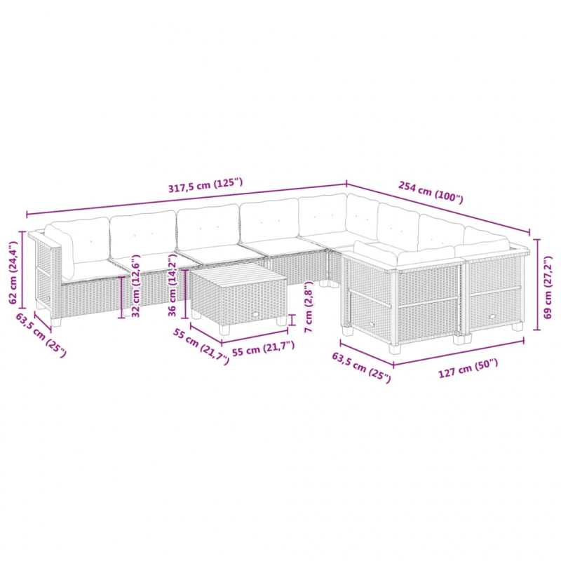10-tlg. Garten-Sofagarnitur mit Kissen Grau Poly Rattan