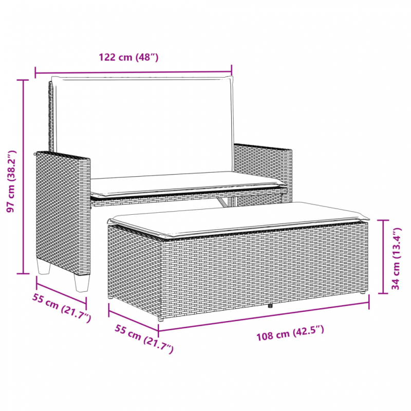 Diese 2-in-1-Gartenbank, die sowohl als Gartensofa als auch als Schlafsofa dient, ist eine praktische und auffällige Ergänzung zu deinem Außenbereich. Langlebiges Material: PE-Rattan, auch als Poly Rattan bekannt, ist ein robustes, pflegeleichtes synthetisches Material, das die Optik von natürlichem Rattan aufweist. Es kennzeichnet sich durch ein geringes Eigengewicht und lässt sich einfach reinigen. Aufgrund seiner Haltbarkeit und Witterungsbeständigkeit wird es häufig bei der Herstellung von Gartenmöbeln verwendet. Vielseitig einsetzbar: Dieses Möbelstück lässt sich sowohl als 2-Sitzer-Bank als auch als Schlafsofa einsetzen. Du kannst es durch Zurückneigen der Rückenlehne und Herausziehen des Hockers von unter der Bank ganz einfach in ein Bett verwandeln. Die Stützplatten hinder den Rückenlehnen erhöhen die Stabilität des Bettes. Bequemes Sitzerlebnis: Dieser Gartensessel mit dick gepolsterten Kissen bietet ein angenehmes Sitzgefühl. Vielseitiger Fußhocker: Der Hocker ist vielseitig einsetzbar und dient als bequeme Fußstütze beim Entspannen auf dem Sofa oder als zusätzlicher Sitzplatz in deinem Garten. Kompakte Aufbewahrung: Der Fußhocker lässt sich platzsparend unter der Sitzfläche verstauen. Gut zu wissen:Wir empfehlen dir, deine Gartenmöbel mit einer wasserdichten Hülle zu schützen, um lange Zeit eine ansprechende Optik aufzuweisen.