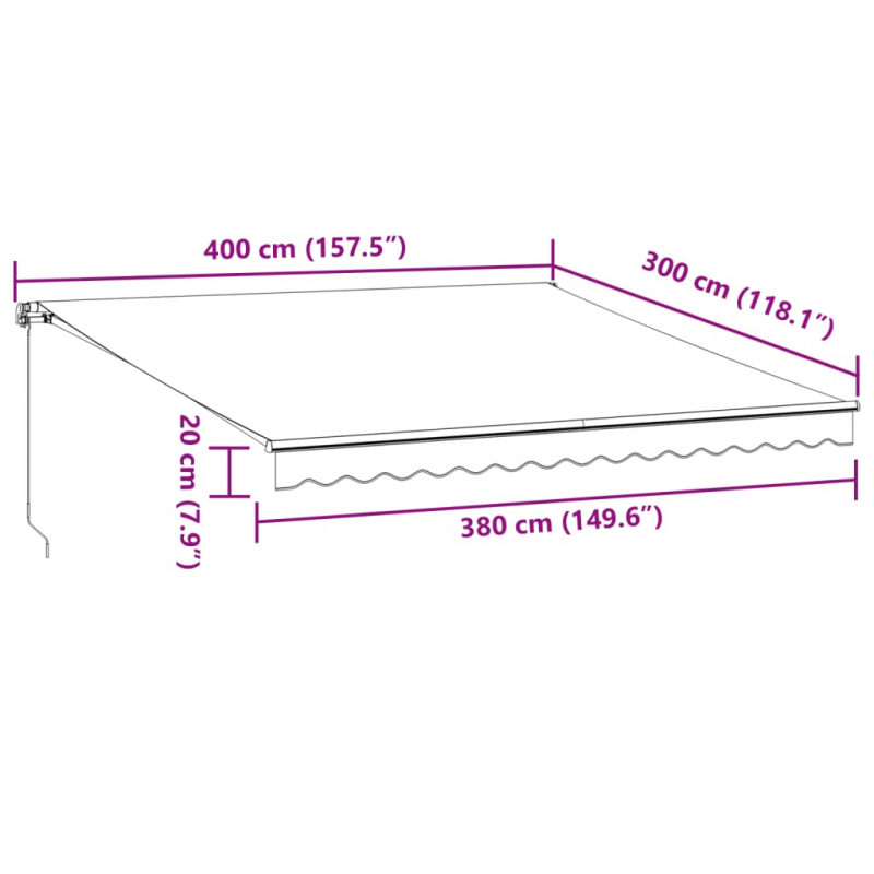 Schaffe einen angenehmen, kühlen Platz auf deiner Terrasse und schütze dich vor UV-Strahlen mit dieser Markise! Langlebiges Material: Der Markisenrahmen ist aus pulverbeschichtetem Aluminium gefertigt, welches Robustheit und Langlebigkeit gewährleistet. Dank PU-Behandlung ist der Markisenstoff UV-beständig. Diese Markise schützt deine Familie und Gäste vor UV-Strahlen und grellem Sonnenlicht.Einfach zu bedienen: Der Winkel und die Höhe können an deine unterschiedlichen Bedürfnisse angepasst werden. Du kannst diese Markise mittels der langen Kurbel leicht ein- und ausfahren.Vielfältige Einsatzmöglichkeiten: Die Markise mit Kurbel zeichnet sich durch ein einfaches und stilvolles Design aus, das sich gut auf deiner Terrasse oder vor Bistros einfügen wird. Der Sonnenschutz eignet sich für eine Vielzahl von Orten, wie Balkone, Terrassen, Höfe, Restaurants, Cafés, Geschäfte und mehr.