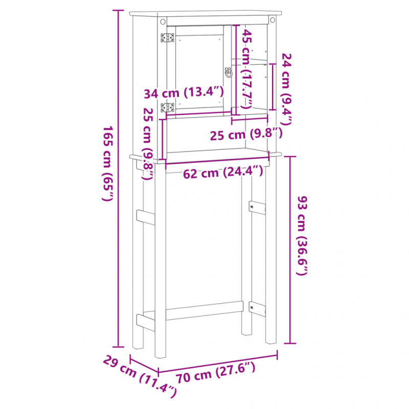 Mit diesem Waschmaschinenschrank kannst du zusätzlichen Stauraum im Bad oder Waschraum schaffen. Langlebiges Material: Massives Kiefernholz ist ein wunderschönes natürliches Material, das für seine Haltbarkeit und Langlebigkeit bekannt ist. Seine gerade Maserung trägt zu seiner ansprechenden Optik bei, während die Aststellen ihm eine rustikale Note verleihen.Reichlich Stauraum: Der Badschrank verfügt über 2 Ablagen und 1 Fach hinter der Tür, die reichlich Platz für Reinigungsmittel wie Seife, Waschmittel, Weichspüler und mehr bieten.Platzsparend: Das Badregal lässt sich über der Waschmaschine oder der Toilette anbringen. Er passt gut in kleine Räume und eignet sich somit ideal für kleinere Bäder und Waschküchen.Metallgriff: Der Waschmaschinenschrank ist mit einem Metallgriff ausgestattet, der das Öffnen und Schließen der Tür erleichtert und gleichzeitig zu seiner ansprechenden Optik beiträgt. Achtung:Um ein Umkippen zu vermeiden, sollte dieses Produkt mit der mitgelieferten Wandhalterung gesichert werden.