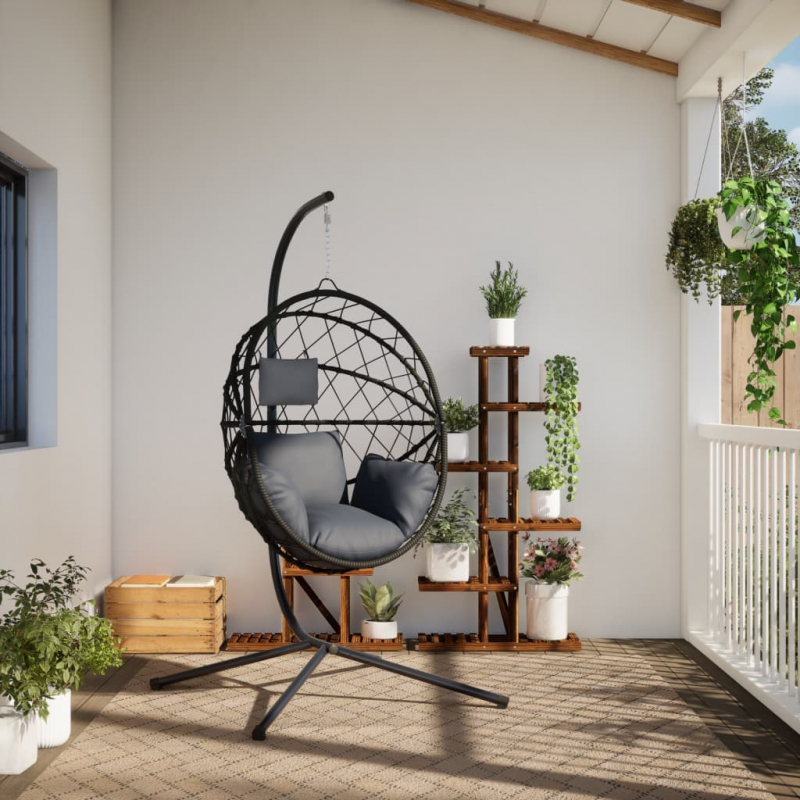 Lehne dich zurück und genieße eine entspannende Zeit in deinem Wohnzimmer auf diesem faszinierenden Hängesessel. Robust und bequem: Der Hängesessel ist mit Rattan und Seil versehen. Er ist somit leicht, strapazierfähig und wird deinem Wohnraum eine natürliche, warme und einladende Atmosphäre verleihen.Stark und stabil: Das Hängesessel-Gestell besteht aus Stahl. Stahl überzeugt durch seine Festigkeit, Haltbarkeit und Korrosionsbeständigkeit, wodurch er die ideale Wahl für verschiedene Zwecke ist, einschließlich Möbelherstellung.Schaukel-Design: Auf diesem Gartenstuhl kannst du sanft hin und her schaukeln und dich in deiner Freizeit entspannen.Bequeme Sitzgelegenheit: Die dick gepolsterten und abnehmbaren Kissen des Hängesessels sorgen für höchsten Sitzkomfort.Abnehmbarer und waschbarer Bezug: Das Kissen verfügt über einen abnehmbaren Bezug, der sich ganz einfach waschen und sauber halten lässt. Gut zu wissen:Wir empfehlen dir, deine Gartenmöbel mit einer wasserdichten Hülle zu schützen, um lange Zeit eine ansprechende Optik aufzuweisen.