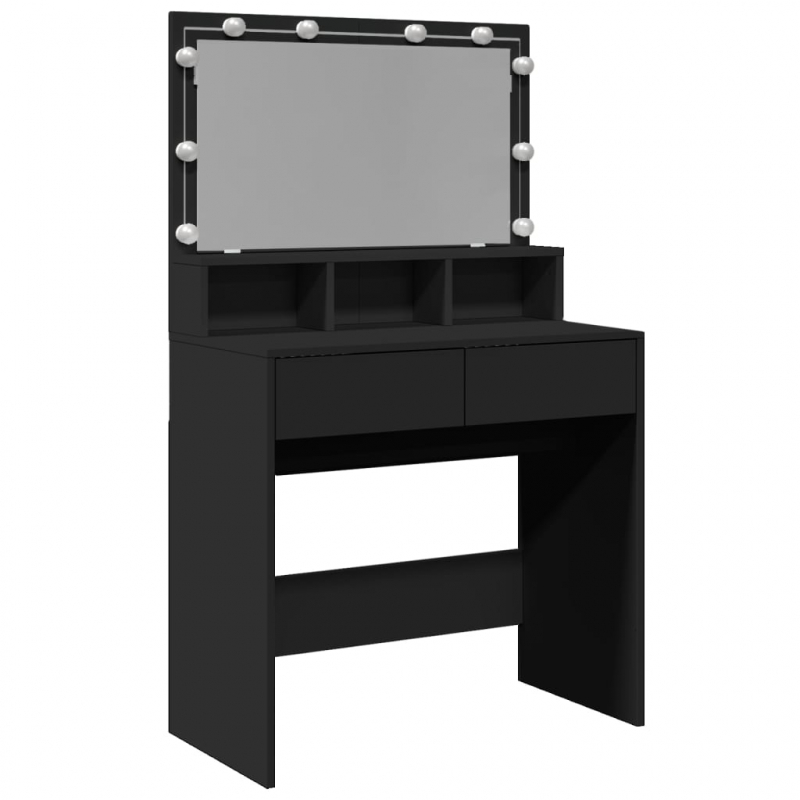 Dieser Schminktisch ist eine großartige Ergänzung zu deinem Schlafzimmer und bietet auch Platz zur griffbereiten Aufbewahrung deiner Kosmetika! Starkes und langlebiges Material: Holzwerkstoff ist ein langlebiges und robustes Material mit einer glatten Oberfläche, das gegen Feuchtigkeit, Verformung und Rissbildung beständig ist, wodurch es eine zuverlässigen Wahl für die Herstellung von Möbeln ist.Viel Stauraum: Der Schminktisch mit 2 Schubladen und 3 Fächern bietet viel Platz, um verschiedene Alltagssachen gut organisiert und in Reichweite aufzubewahren.Allzweckspiegel: Der schöne Spiegel bietet eine klare Sicht beim Auftragen von Make-up und verleiht dem Schminktisch eine elegante Note.LED-Leuchten: Der Schminktisch verfügt auch über LED-Leuchten mit USB, die einfach von Warmweiß auf Kaltweiß umgeschaltet werden können. Dabei beleuchten die LED-Lampen rund um den Spiegel dein Gesicht optimal. Achtung:Um ein Umkippen zu vermeiden, sollte dieses Produkt mit der mitgelieferten Wandhalterung gesichert werden.