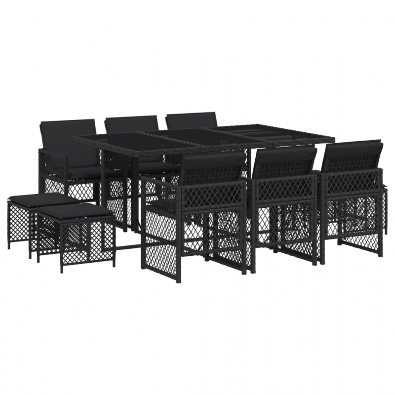 Diese Garten-Essgruppe ist eine ideale Wahl für Mahlzeiten im Freien oder einfach nur zum Entspannen im Garten, Hinterhof oder auf der Terrasse. Langlebiges Material: PE-Rattan, auch als Poly Rattan bekannt, ist ein robustes, pflegeleichtes synthetisches Material, das die Optik von natürlichem Rattan aufweist. Es kennzeichnet sich durch ein geringes Eigengewicht und lässt sich einfach reinigen. Aufgrund seiner Haltbarkeit und Witterungsbeständigkeit wird es häufig bei der Herstellung von Gartenmöbeln verwendet. Tischplatte aus Glas: Die Tischplatte des Gartentisches besteht aus starkem und langlebigem Hartglas, sodass sie leicht mit einem feuchten Tuch gereinigt werden kann und deinem Außenbereich einen Hauch von Eleganz verleiht. Platzsparende Aufbewahrung: Dank der klappbaren Rückenlehne lassen sich die Stühle unter dem Tisch verstauen. Zudem finden auch die Hocker Platz unter den Stühlen, sodass die gesamte Essgruppe bei Nichtgebrauch eine platzsparende Würfelform bildet, um deinen verfügbaren Platz optimal auszunutzen. Bequemes Sitzerlebnis: Dieser Gartensessel mit dick gepolsterten Kissen bietet ein angenehmes Sitzgefühl. Abnehmbarer und waschbarer Bezug: Die Sitzkissen verfügen über abnehmbare Bezüge, die sich ganz einfach waschen und reinigen lassen. Dank der Klappen an der Rückseite können die Sitzkissen ganz einfach an den Stühlen befestigt werden. Gut zu wissen:Wir empfehlen dir, deine Gartenmöbel mit einer wasserdichten Hülle zu schützen, um lange Zeit eine ansprechende Optik aufzuweisen.