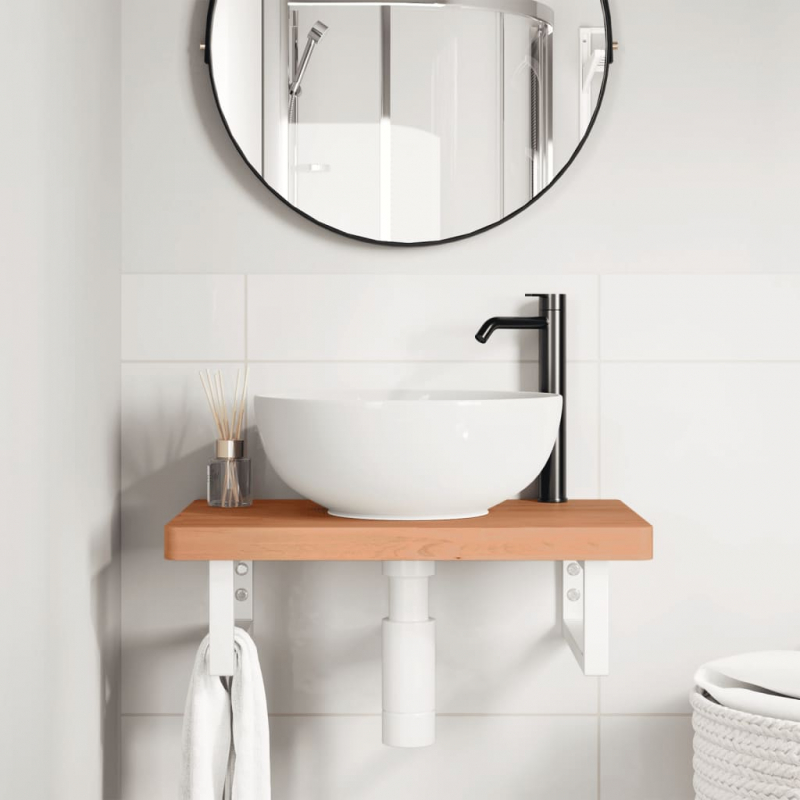 Die Waschtischplatte wird sicher an der Wand befestigt und bietet eine elegante und platzsparende Lösung für dein Badezimmer. Robust und langlebig: Dieses Waschbeckenregal besteht aus einem Stahlgestell und einer Oberplatte aus massivem Buchenholz, was es robust, stabil und langlebig macht. Platzsparend: Das Schweberegal bietet reichlich Platz für Cremes und verschiedene Kleinigkeiten. Dank der rechteckigen Form der Halterungen kannst du auch Handtücher oder andere Sachen darauf aufhängen. Einfache Verwendung: Die Holzplatte ist nicht vorgebohrt, so dass dein Waschbecken je nach Bedarf links, rechts oder mittig installiert werden kann. Dank der vorgebohrten Löcher in der Halterung kann diese einfach mit der Tischplatte montiert und an der Wand befestigt werden. Vielseitige Anwendungsmöglichkeiten: Dank ihres modernen Designs fügt sie sich in verschiedene Arten von Bädern ein. Gut zu wissen:Die Schrauben sind nicht im Lieferumfang enthalten. Du kannst die Schrauben auf der Grundlage der unten aufgeführten Informationen separat erwerben. Wandbefestigung: 2 Stück M8-Dehnschrauben pro Halterung Holzplatte: 2 Stück M5x18-Schrauben (T=2) oder 2 Stück M5x20-Schrauben (T=2,5/4 cm) pro Halterung