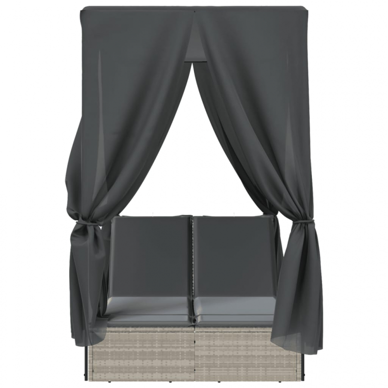 Entspanne dich und genieße deinen Außenbereich auf dieser bequemen Doppelliege! Langlebiges Material: PE-Rattan, auch als Poly Rattan bekannt, ist ein robustes, pflegeleichtes synthetisches Material, das die Optik von natürlichem Rattan aufweist. Es kennzeichnet sich durch ein geringes Eigengewicht und lässt sich einfach reinigen. Aufgrund seiner Haltbarkeit und Witterungsbeständigkeit wird es häufig bei der Herstellung von Gartenmöbeln verwendet.Verstellbare Rückenlehne: Dieses Möbelstück verfügt über eine 4-fach verstellbare Rückenlehne, um stets ganz einfach die bequemste und geeignetste Position zum Entspannen zu finden.Praktisches Dach und Vorhänge: Dank Dach und Vorhänge genießt du den ganzen Tag über ein kühles und angenehmes Plätzchen in deinem Außenbereich.Bequemes Sitzerlebnis: Dieser Gartensessel mit dick gepolsterten Kissen bietet ein angenehmes Sitzgefühl.Abnehmbarer und waschbarer Bezug: Diese Sitzkissen verfügen über abnehmbare Bezüge für einfaches Waschen und Pflegen. Gut zu wissen:Wir empfehlen dir, deine Gartenmöbel mit einer wasserdichten Hülle zu schützen, um lange Zeit eine ansprechende Optik aufzuweisen.