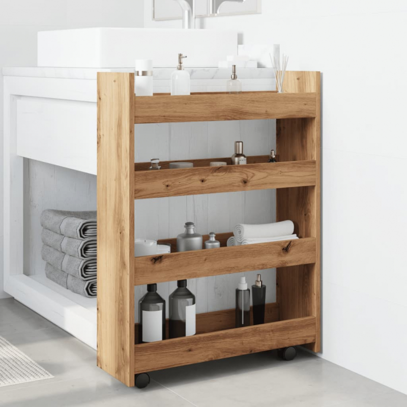 Dieser schmale Aufbewahrungswagen ist eine dekorative und praktische Ergänzung für dein Zuhause. Starkes und langlebiges Material: Holzwerkstoff ist ein langlebiges und robustes Material mit einer glatten Oberfläche, das gegen Feuchtigkeit, Verformung und Rissbildung beständig ist, wodurch es eine zuverlässigen Wahl für die Herstellung von Möbeln ist.Viel Stauraum: Der schmale Küchenwagen bietet viel Platz, um verschiedene Alltagssachen gut organisiert und in Reichweite aufzubewahren.Leicht zu bewegen: Dieser Rollwagen mit Lenkrollen kann leicht an den gewünschten Ort gebracht werden. Zwei Rollen sind arretierbar, was dieses Aufbewahrungsmöbel an Ort und Stelle stabil hält.Vielseitige Anwendungsmöglichkeiten: Je nach Bedarf kannst du diesen Ordnungswagen im Wohnzimmer, in der Küche oder im Bad einsetzen. Dank seines schmalen Designs fügt er sich auch in kleinere Räume ein.
