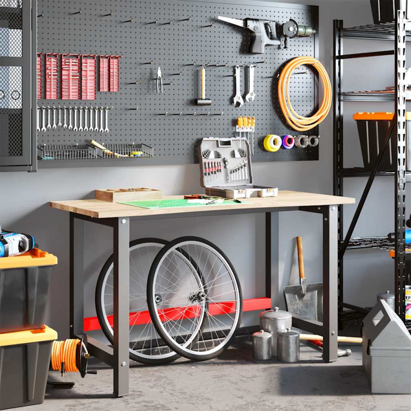 Die Werkbank ist ein großartiger Helfer, wenn du Reparaturarbeiten erledigen oder deine Heimwerker-Träume erfüllen möchtest! Robustes und stabiles Material: Massives Eichenholz ist für seine Festigkeit, Haltbarkeit und schöne Maserung bekannt, weshalb es sich hervorragend für die Herstellung von langlebigen Möbeln eignet. Durch ihre natürliche Beständigkeit gegen Insektenbefall und Schimmelbildung sehen Eichenmöbel selbst nach jahrelangem Gebrauch brandneu aus.Stabiles und haltbares Gestell: Aus pulverbeschichtetem Metall gefertigt, ist das Gestell robust, stabil, langlebig, korrosions- und witterungsbeständig und gewährleistet dadurch eine lange Lebensdauer.Großer Arbeitsbereich: Der Arbeitstisch verfügt über eine geräumige Arbeitsplatte, die Platz für Bohrer, Kabeltrommel und weiteres Werkzeugzubehör bietet.Vielseitig einsetzbar: Mit ihrem schlichten und klaren Design lässt sich die Werkbank je nach Bedarf auch als Arbeitstisch verwenden. Sie ist daher ein praktisches und bequemes Möbelstück. Gut zu wissen:Jedes Stück ist ein Unikat, das in Farbe und Maserung variiert. Die Lieferung erfolgt in zufälliger Reihenfolge, wodurch die Exklusivität und Individualität deines Produkts gewährleistet wird.Wir empfehlen, einen Schraubendreher anstelle einer elektrischen Bohrmaschine zu verwenden, um Holzrisse beim Anbringen der Beine zu vermeiden. Achtung:Die Tischplatte ist mit keinen vorgebohrten Löchern versehen und Schrauben sind nicht im Lieferumfang enthalten. Daher müssen die Löcher gebohrt und die Schrauben vor dem Zusammenbau dieses Arbeitstisches erworben werden.