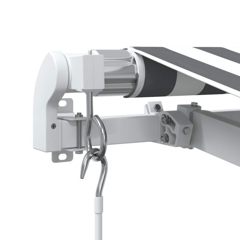 Vor der Montage und Verwendung des Produkts sollte die Bedienungsanleitung gelesen werden. Diese Anleitung für spätere Referenzzwecke aufbewahren. Dieses Produkt ist ausschließlich für den Außenbereich und den Hausgebrauch als Sonnenschutz oder Dekoration vorgesehen. Es darf niemals für andere Zwecke verwendet oder verändert werden. Nicht an Orten verwenden, an denen Vibrationen, Stöße oder hohe Temperaturen auftreten, wie z. B. an Wänden in der Nähe von Öfen. Bei der Montage und Einstellung der Markise immer geeignete persönliche Schutzausrüstung tragen. Bei Arbeiten in großer Höhe besteht Absturzgefahr. Verwendet eine geeignete Absturzsicherung. Seid bei der Montage vorsichtig, es besteht Quetsch- und Schergefahr. Entfernt NICHT die Sicherheitsumwicklungen. Diese Umwicklungen dürfen erst entfernt werden, nachdem alle Montageschritte abgeschlossen sind, alle Schrauben festgezogen sind und das Produkt an der Wand befestigt ist. Wenn die Umwicklungen zu früh entfernt werden, kann dies zu schweren Verletzungen führen. Dieses Produkt und seine Befestigungsteile sind nur für die Montage an einer glatten Betonwand oder stabilem unverputztem Mauerwerk geeignet. Wenn die Wand/das Mauerwerk Risse aufweist, muss ein Fachmann hinzugezogen werden. Wenn das Gebäude eine Außenhülle hat (z. B. Isolierung, doppelte Ziegelwand oder Ziegelverkleidung), sollte die Montage von einem Fachmann durchgeführt werden. Niemals an hohen und windigen Orten installieren, da die Markise herunterfallen und Personen verletzen kann. Die Markise darf nicht installiert werden, wenn sie beschädigt ist oder Teile fehlen. Die Außenjalousie muss eingefahren werden, wenn die Windgeschwindigkeit 28 km/h übersteigt. Vor dem Öffnen der Markise sicherstellen, dass alle Halterungen sicher in den Wandpfosten montiert sind und alle Schrauben ordnungsgemäß angezogen sind. Die Markise IMMER SCHLIESSEN, wenn starker Wind oder Sturm weht, es regnet oder sie nicht benutzt wird. Andernfalls kann es zu Verletzungen und/oder Sachschäden kommen. Außerdem stehen die Ausleger unter hoher Spannung und können schwere Schäden oder Verletzungen verursachen. Kinder sollten beaufsichtigt werden, um sicherzustellen, dass sie nicht mit dem Gerät spielen. Nicht verwenden, wenn eine Reparatur oder Einstellung erforderlich ist. Die Markise nicht bedienen, wenn in der Nähe Wartungsarbeiten wie z. B. Fensterputzen durchgeführt werden. Der Betrieb bei Frost kann die Markise beschädigen. Keine schweren Gegenstände auf den Rahmen legen, da diese herunterfallen und Schäden verursachen können. Zu fest oder zu locker angezogene Befestigungselemente können das Produkt beschädigen oder eine Gefahr für Personen darstellen. Warnung: Der Stoff darf sich während des Betriebs nicht absenken, da sich sonst Wasser darauf ansammelt. Bitte den Stoff nicht auftrennen und waschen. Wenn der Stoff ersetzt werden muss, wenden Sie sich bitte an Experten. Vorsicht bei der Betätigung der manuellen Auslösung bei eingefahrener Außenjalousie, da diese aufgrund schwacher oder gebrochener Federn schnell herunterfallen kann. Achtung! Starke Feder beim Öffnen! Entfernen Sie dieses Seil NICHT, bevor alle Montageschritte (mit allen Schrauben fest angezogen) abgeschlossen sind und der Gegenstand sicher an der Wand angebracht ist! Warnung! Vorsicht beim Lösen der Arme, da diese unter Spannung stehen! Ein plötzliches Lösen des Arms einer Gelenkarmmarkise kann zu Verletzungen führen. Warnung: Die Bedienungsanleitung muss vor der Verwendung des Produkts gelesen werden. Warnung: Der Betrieb unter frostigen Bedingungen kann das Produkt beschädigen. Verwendung im Außenbereich (an Gebäuden und bei Bauarbeiten).