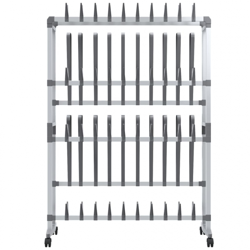 Dieses trendige und mobile Schuhregal kann eine große Anzahl von Schuhen aufnehmen und ist somit eine ideale Wahl für die ganze Familie. Robuster Rahmen: Die Alurahmen sorgen für Robustheit und Stabilität.Mobil: Dank vier freilaufender Rollen lässt sich das Schuhregal leicht umher verschieben.Praktisches Design: Die Schuhablage bietet Platz für bis zu 40 Paar Schuhe und 10 Paar Stiefel und spart durch ihr einzigartiges Design enorm viel Platz.