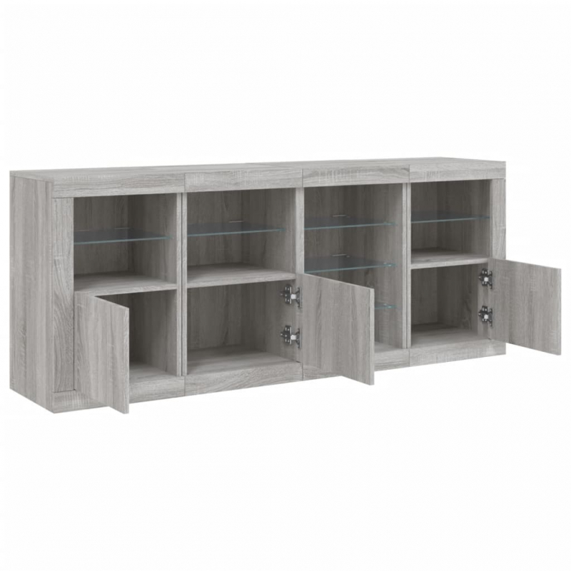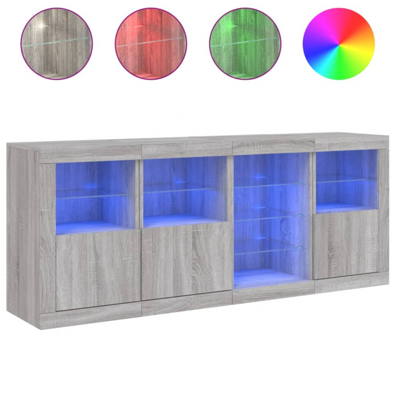 Dekoriere dein Zuhause mit diesem modernen Sideboard mit LED-Beleuchtung, das sich leicht mit Möbeln in jedem Stil kombinieren lässt. Langlebiges Material: Der Holzwerkstoff ist von außergewöhnlicher Qualität mit glatter Oberfläche und zeichnet sich außerdem durch Festigkeit, Stabilität und Widerstandsfähigkeit gegen Feuchtigkeit aus.RGB-LED-Lichter: Das Buffet ist mit leuchtenden RGB-LED-Leuchten ausgestattet. Mit verschiedenen anpassbaren Menüs kannst du die Farbe der Lichter mühelos ändern und sie sogar so einstellen, dass sie sich automatisch anpassen. Diese LED-Leuchten unterstreichen nicht nur den modernen Look des Sideboards, sondern tragen auch zu seiner trendigen Ausstrahlung bei.Ausreichend Stauraum: Der Aufbewahrungsschrank bietet viel Platz, um deine alltäglichen Dinge übersichtlich und leicht zugänglich aufzubewahren.Präsentationsfunktion: Die robuste Oberseite des Flurschranks eignet sich ideal zum Ausstellen von Dekorationsgegenständen, Bilderrahmen oder Topfpflanzen.Praktische Türen: Verstecke deine Utensilien hinter den Türen des Seitenschranks, um sie vor Staub zu schützen. Gut zu wissen:Das Produkt verfügt über einen USB-Anschluss, für den eine zertifizierte 5V-USB-Stromquelle erforderlich ist (nicht im Lieferumfang enthalten). Achtung:Um ein Umkippen zu vermeiden, sollte dieses Produkt mit der mitgelieferten Wandhalterung gesichert werden.