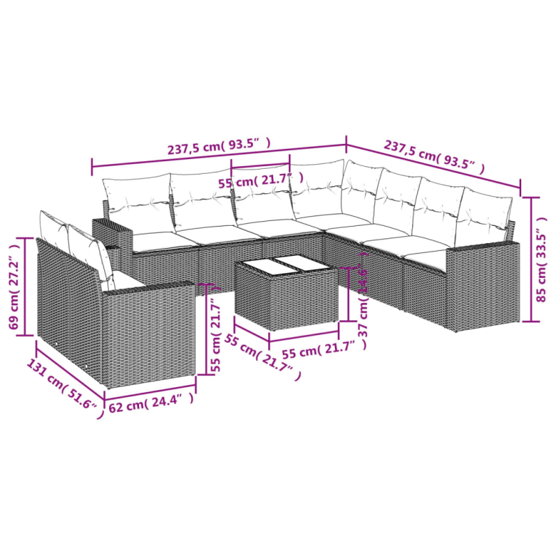 10-tlg. Garten-Sofagarnitur mit Kissen Braun Poly Rattan