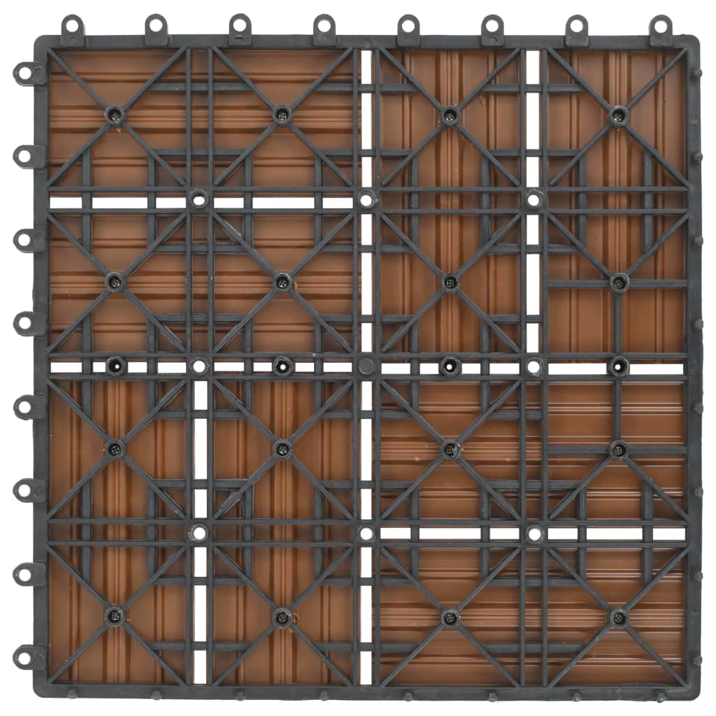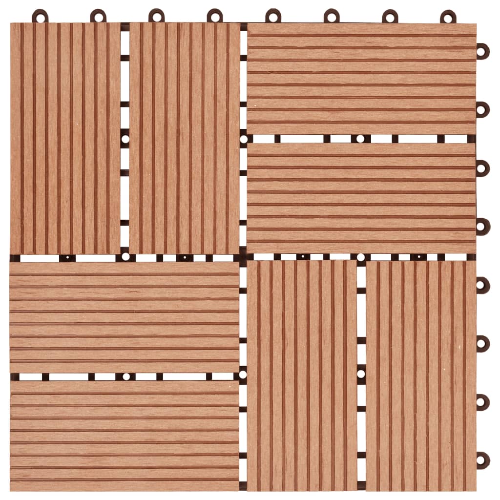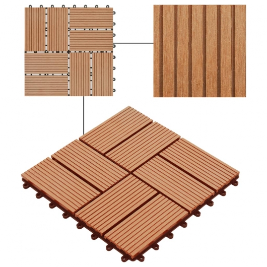 Dieses Dielenset aus WPC besteht aus 11 Dielen mit einer individuellen Fliesengröße von 30 x 30 cm und bedeckt eine Gesamtfläche von 1 Quadratmeter. Es ist perfekt für Terrassen, Balkone, Badezimmer oder Ihren Pool oder Wellnessbereich. Dank Klicksystem lassen sich diese qualitativ hochwertigen Dielen aus WPC ganz schnell und einfach verbinden und verlegen, ohne dass Werkzeuge dafür erforderlich sind. Aus Holz-Kunststoff-Verbund hoher Qualität gefertigt, sind unsere Fliesen sowohl wasserbeständig als auch langlebig.