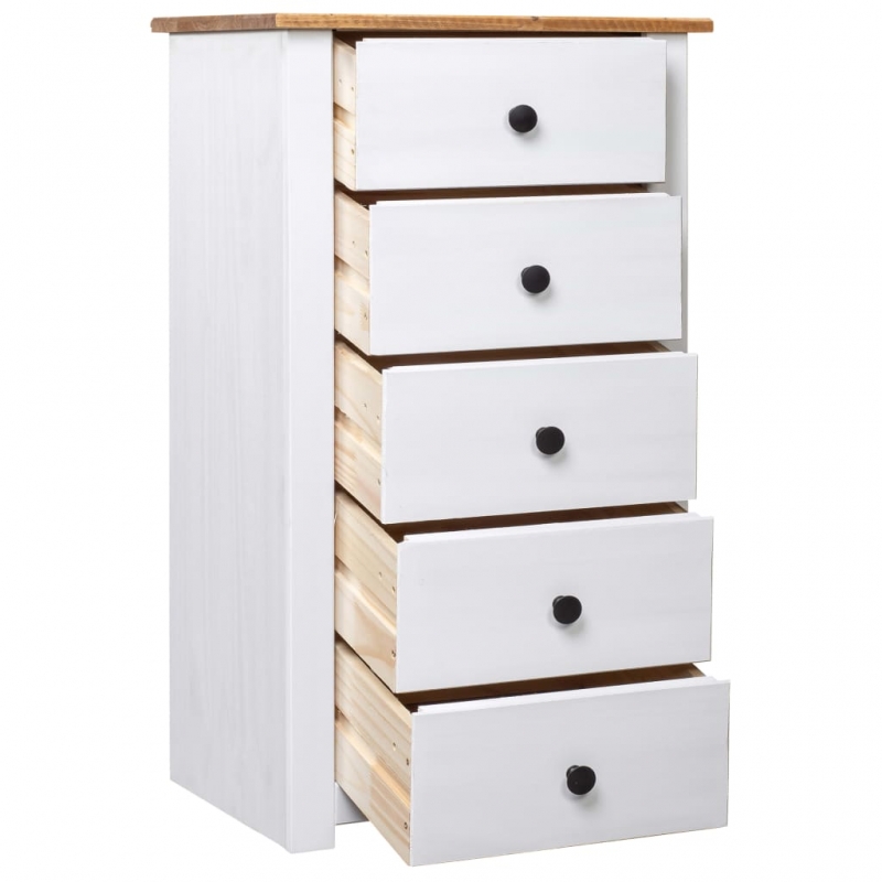 Das Sideboard aus massivem Kiefernholz ist eine tolle Ergänzung für Ihr Schlafzimmer, Wohnzimmer oder Büro! Es kann auch als Telefonständer neben Ihrem Sofa verwendet werden! Aus massivem Kiefernholz gefertigt, ist der Panama Schubladenschrank äußerst langlebig und robust. Das Highboard bietet mit seinen 5 Schubladen viel Stauraum. Außerdem eignet sich die stabile Ablagefläche ideal zum Ausstellen von Dekorationsgegenständen, Bilderrahmen oder Topfpflanzen. Dieses Möbelstück lässt sich leicht mit einem trockenen Tuch abwischen. Der Beistellschrank ist leicht zu montieren.