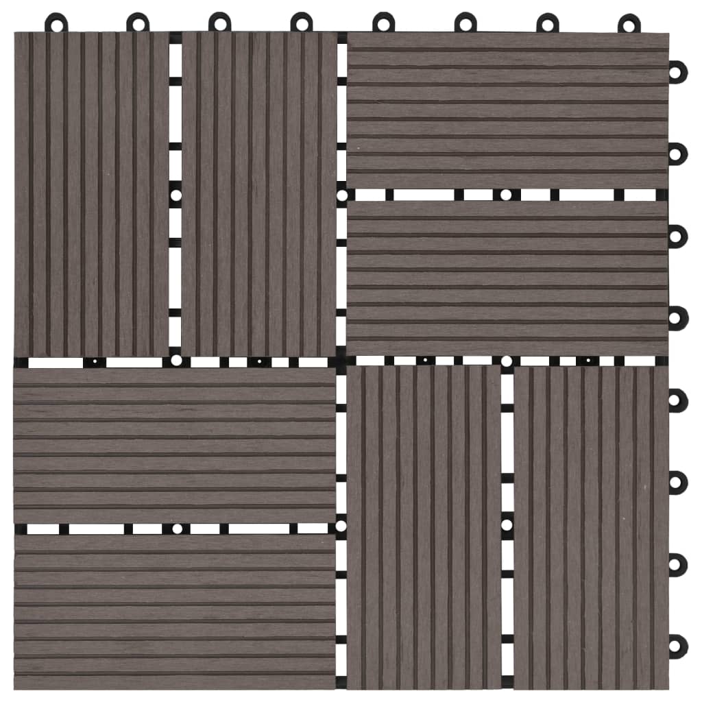 Dieses Dielenset aus WPC besteht aus 11 Dielen mit einer individuellen Fliesengröße von 30 x 30 cm und bedeckt eine Gesamtfläche von 1 Quadratmeter. Es ist perfekt für Terrassen, Balkone, Badezimmer oder Ihren Pool oder Wellnessbereich. Dank Klicksystem lassen sich diese qualitativ hochwertigen Dielen aus WPC ganz schnell und einfach verbinden und verlegen, ohne dass Werkzeuge dafür erforderlich sind. Aus Holz-Kunststoff-Verbund hoher Qualität gefertigt, sind unsere Fliesen sowohl wasserbeständig als auch langlebig.